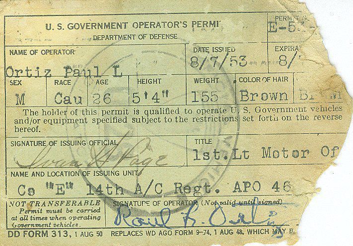 U.S. Government Operator's Permit issued by the Department of Defence to Roy Ortiz certifying that he is qualified to operate U.S. Government vehicles and/or equipment . The date issued is 8/7/1953, during Ortiz's service in the Korean War.Collection