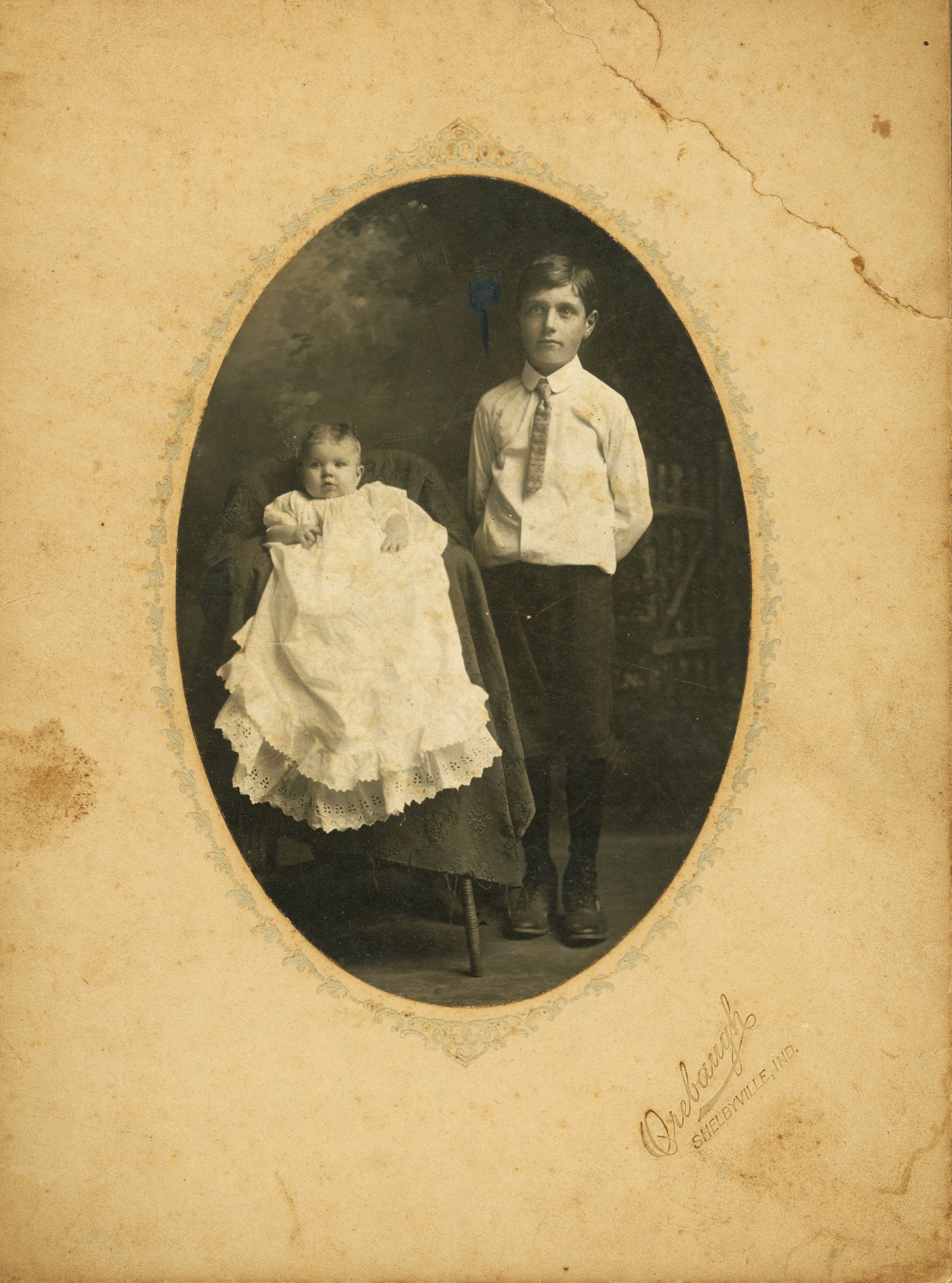 Unidentified Baby and Young Boy. Baby is in white and the boy is wearing a white shirt and tie. Baby is seated and boy is stanging.Collection