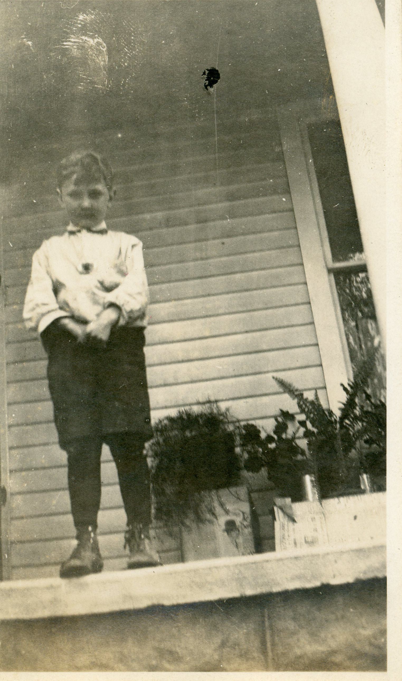 A sepia-toned snapshot of a young boy standing on a covered porch. He wears a light-colored shirt, dark knee pants, and tall dark socks or tights.Photograph Details