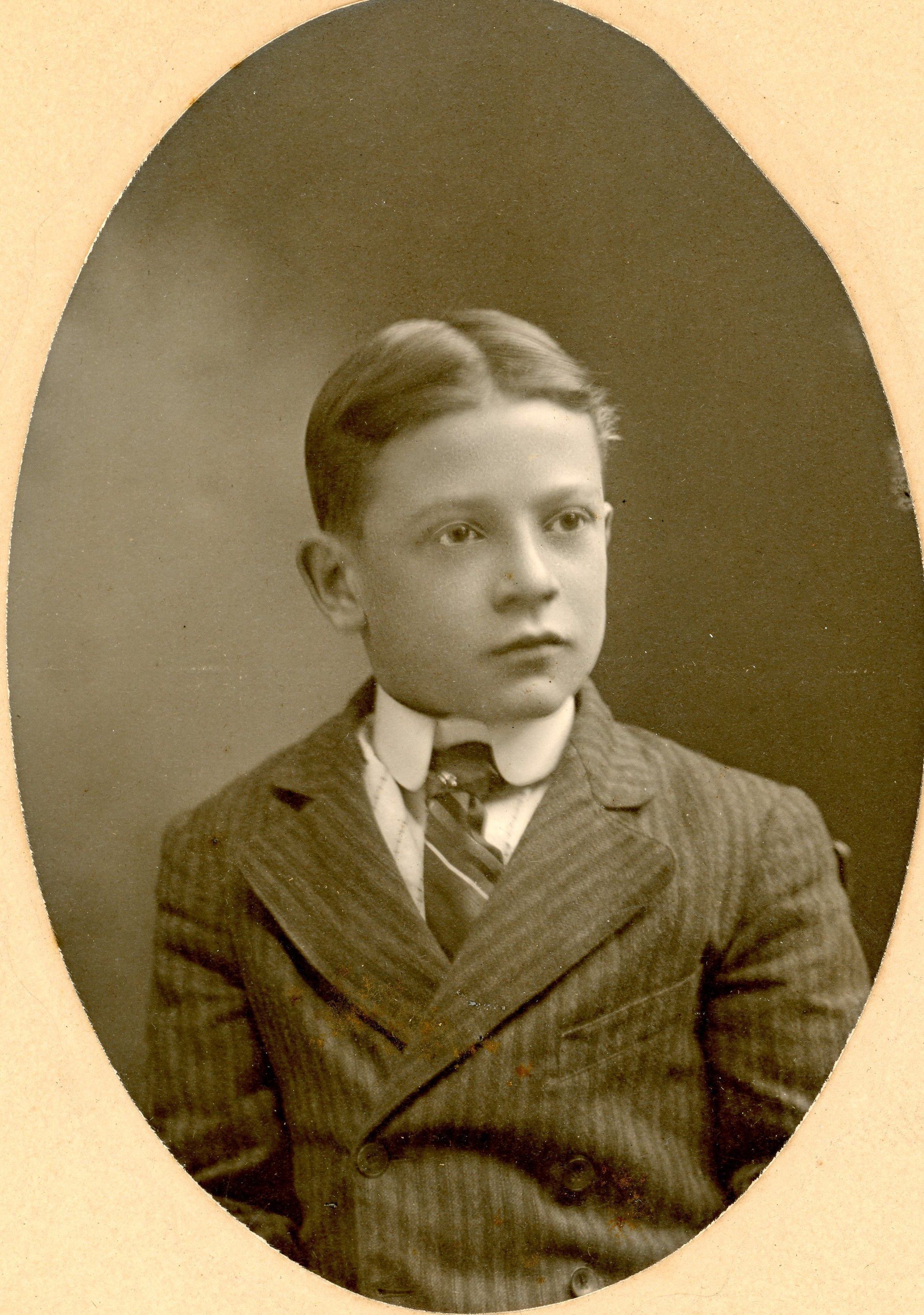 An oval black-and-white photographic portrait of a young boy with his hair parted down the middle. He wears a full striped suit with a tie.Collection