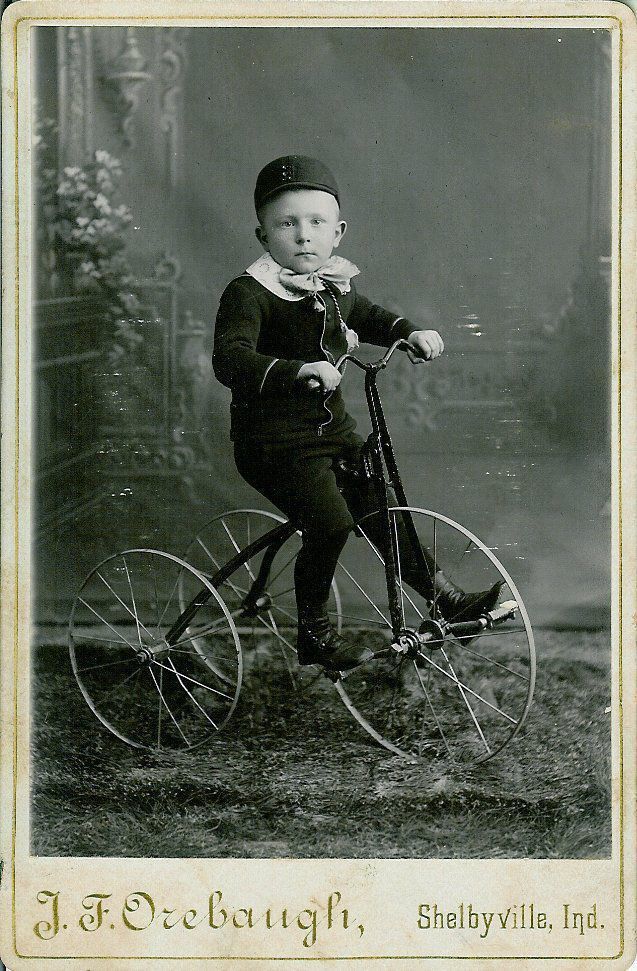 Black and white cabinet print; subject is young boy, full image; sitting on a large tricycle; wearing round crowned cap with narrow brim and 3 buttons on front of cap; has very wide white collar and some kind of scarf tied in a bow at neck and visible under boy is some kind of a cord; jacket is dark, secures in front w/self-covered buttons, jacket has piping down front, at cuffs and on what appears to be a sailor collar on the back; has on knee pants, dark hose and high top button shoes mount has gold colored band around the edge.