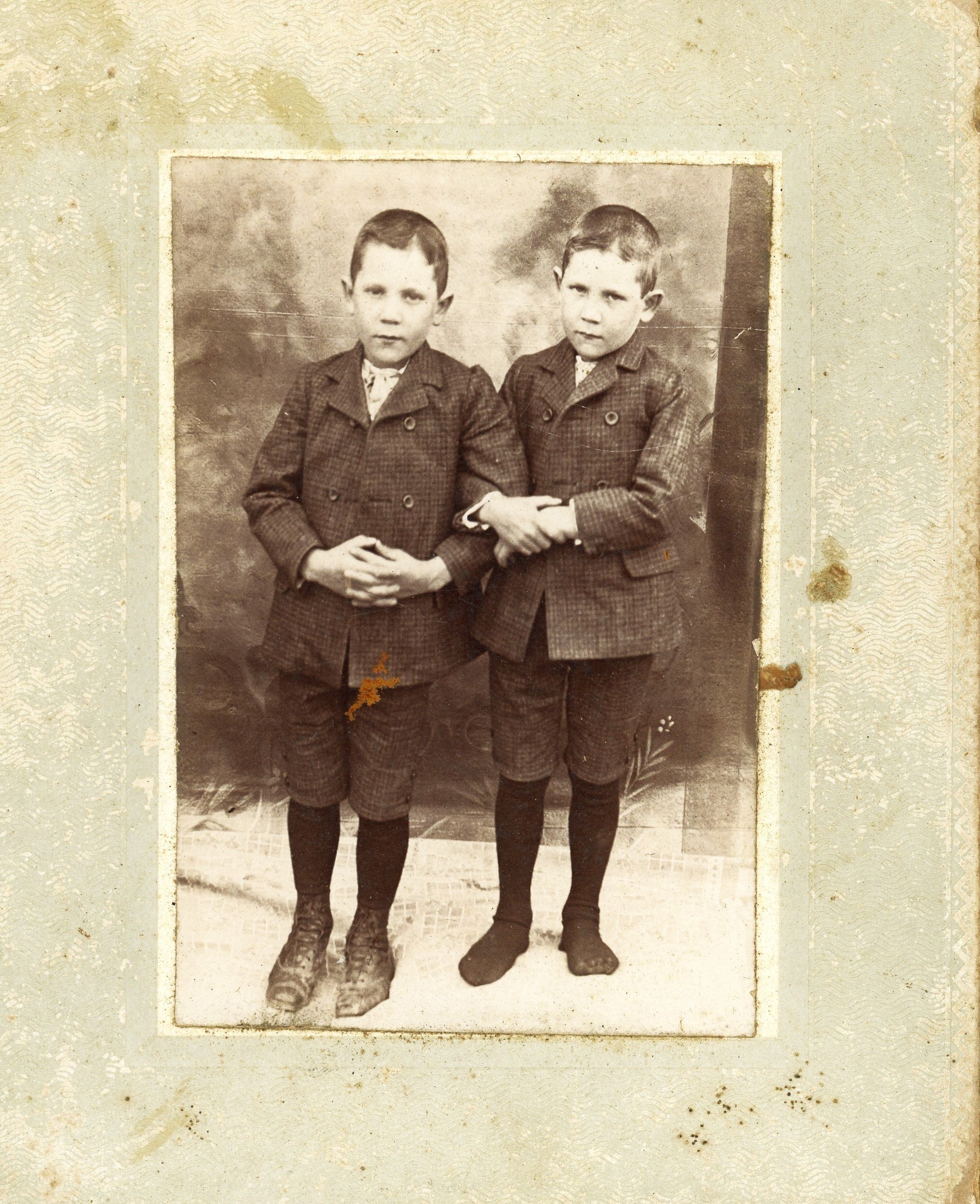 Unidentified Boys Dressed alike in Dark Shorts and Jackets. Arms locked together - Look alike possibly twin brothers.Collection