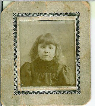 Sepia-toned photographic print in portrait format. Image is of a child, probably a girl. Heavy bangs on forehead, shoulder-length hair, dark garment with darker yoke. Photo is glued to cardboard mount.Collection