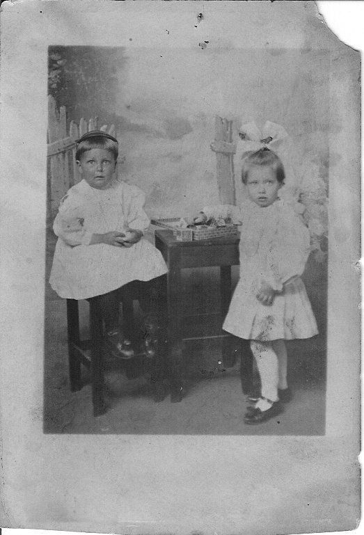 Black and white photographic postcard in portrait format. Image is of two small children posed facing the camera. On left is a child sitting on a tall stool wearing a cap, hair light with bangs, white long-sleeved garment, dark hose, dark shoes. On right is girl with right arm posed on table. Large white bow on top of head, white long-sleeved garment, white hose, black mary jane shoes.Collection