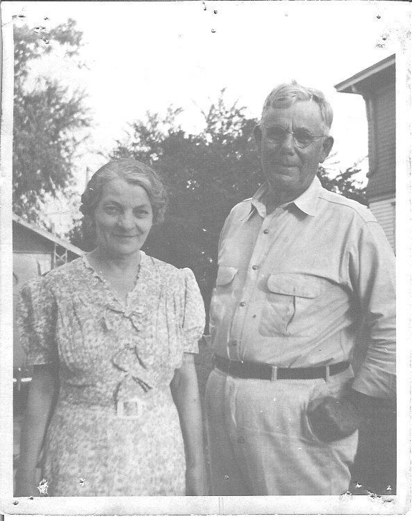 Black and white photographic print in snapshot of a couple probably in their 60's, standing facing camera, view is mid-thigh up; woman is about a head shorter than man, hair appears to have a slight part on right side & combed back away from face, some waves on side, wearing print short sleeve dress, pleated front & 3 bows on bosom; man's pants and shirt are same shade, dark belt, shirt open at collar, flaps on 2 shirt pockets, has grey hair parted on left & appears to be thick on top despite receding hair line,has part of left hand in pant pocket.