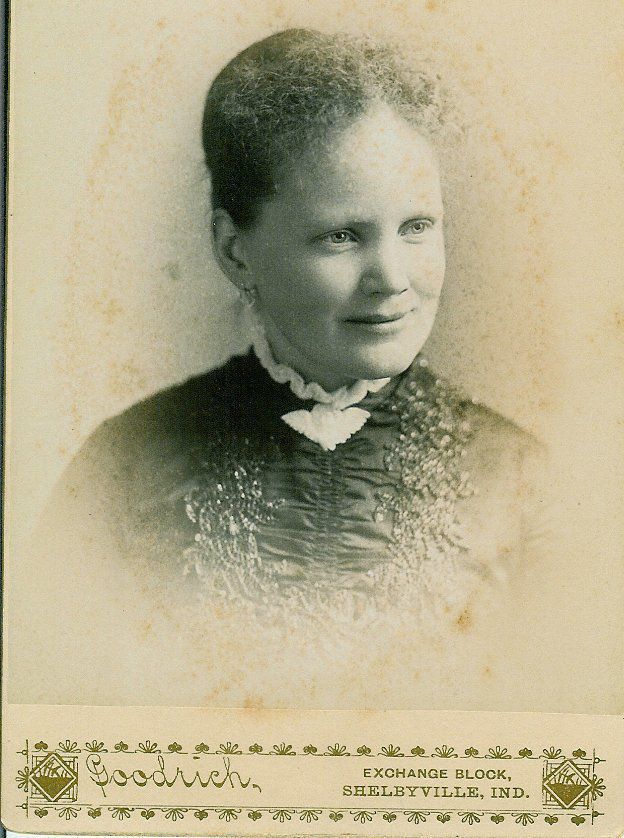 Black and white cabinet photograph on mount is image of an unidentified woman. Hair is tightly curled at top in front; combed back above ears; earring in right ear; high-collared dark dress trimmed around front panel with heavy lace or beading; gathering up center front of yoke; white ruffled trim at top of neckline; white winged cherub pin at throat. Printed in gold at bottom of mount: "Goodrich,/Exchange Block, Shelbyville, Ind." Found on the 7th page of photo album 83.81.47.Collection
