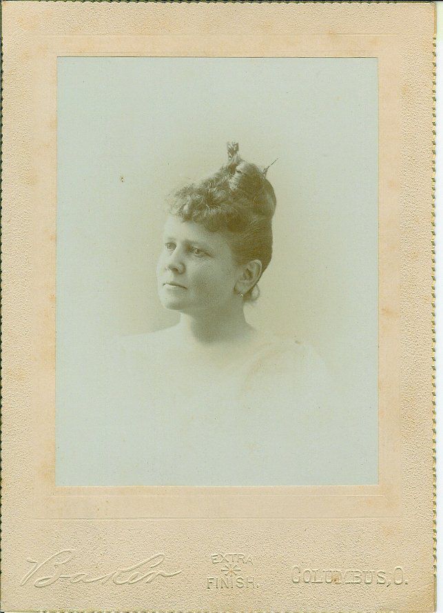 Black and white cabinet photograph on ivory mount. Image is of an unidentified female, head only, rest of image purposely faded out. Woman has upswept hair, twisted on top and back of head, short curly bangs on forehead. Pierced earring in left ear, no other ornamentation. Bottom of mount is imprinted, no ink: "Baker/Extra Finish/Columbus, O." Photo was found on 40th page of 83.81.47 photo album that belonged to Dr. William Trevitt Knapp.Collection