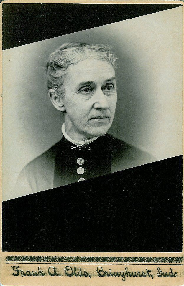 Donation, 03/1963. Used by Zerilla Kimberling. Cabinet photo probably on albumen paper. Head and shoulders pose of an unidentified elderly woman. Hair is parted in middle and pulled back. Has a ruffled edge on her collar and a pin to fasten it. There is a single row of large buttons down the front of her garment. Photo runs on an angle area above her head and is blacked out below her shoulders. Bottom of mount is marked: "Frank A. Olds, Bringhurst, Ind."Collection