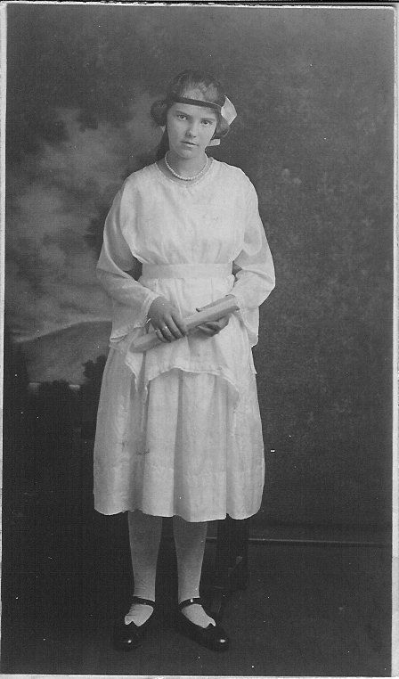Black and white photographic print of a young woman in a white dress, low-neck style, wearing pearls, dress has loose sleeves with lace edge, knee-length, apron effect with tassles on corners of apron. Her head is tilted to left, hair puffed over waist, bow in back with black ribbon head band. White stockings, dark patent shoes with straps. She is holding a scroll with her right hand on top of scroll. Studio backdrop and a stool in back of girl. Photo was salvaged from the Wooten house in Morristown that was to be torn down and burned.Collection