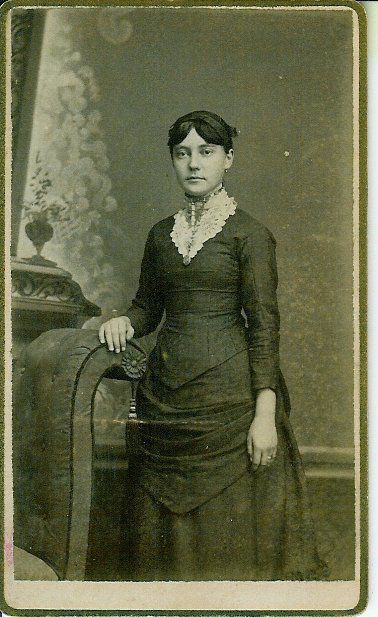Donation, 03/1963. Used by Zerilla Kimberling. Carte-de-visite probably on albumen paper. 3/4 front view of young woman. Her right hand is resting on the back of a chair. She appears to be wearing a dark hair ribbon with her bangs split and swept back over her eyes. She has earrings and a lace collar. There is some sort of metal band at the top of the lace and a pin at the bottom. she has a wedding ring.Collection