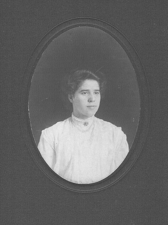 Black and white photographic print in oval shape on mount. Unidentified female has dark hair in pompadour-style, dark eyebrows, dark eyes, facing left in bust pose, blouse in white with high collar and vertical tucks and lace trim, a brooch at her throat, necklace below brooch. Salvaged from the Wooten house in Morristown, IN which was torn down and burned.Collection