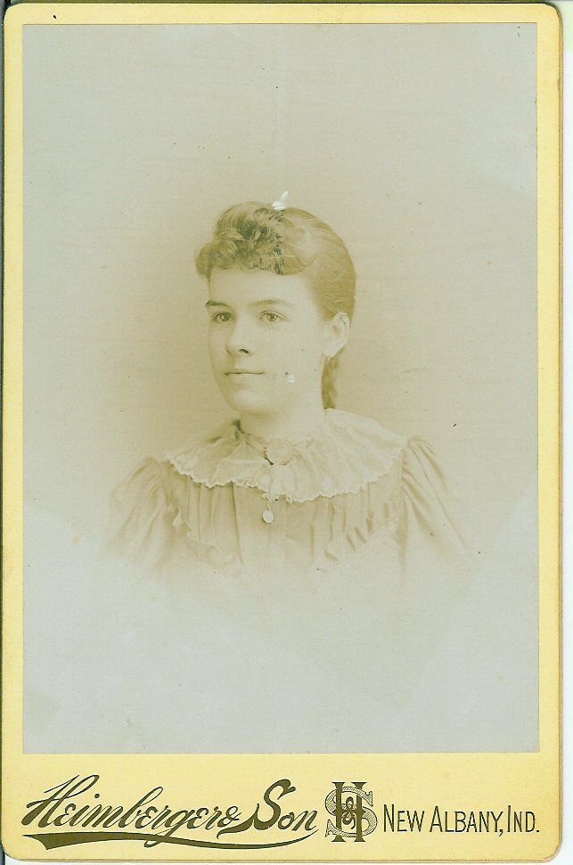 Black and white cabinet photograph of an unidentified young woman; hair has curled bangs at front; combed smoothly back with at least one braid down the back; dress has a wide circular collar of white; round pin at the throat; a second pin is below center of collar and has a coin-like piece hanging from it; yoke of dress is tucked and attaches to the bodice with pleated ruffle; sleeves are gathered at the shoulder seam. Mount is printed in gold at bottom: "Heimberger & Son/H&S/ NEW ALBANY, IND." Additional printing on back of mount with ornate advertising. Found on 11th page of 1983.081.022 (photo album).Collection