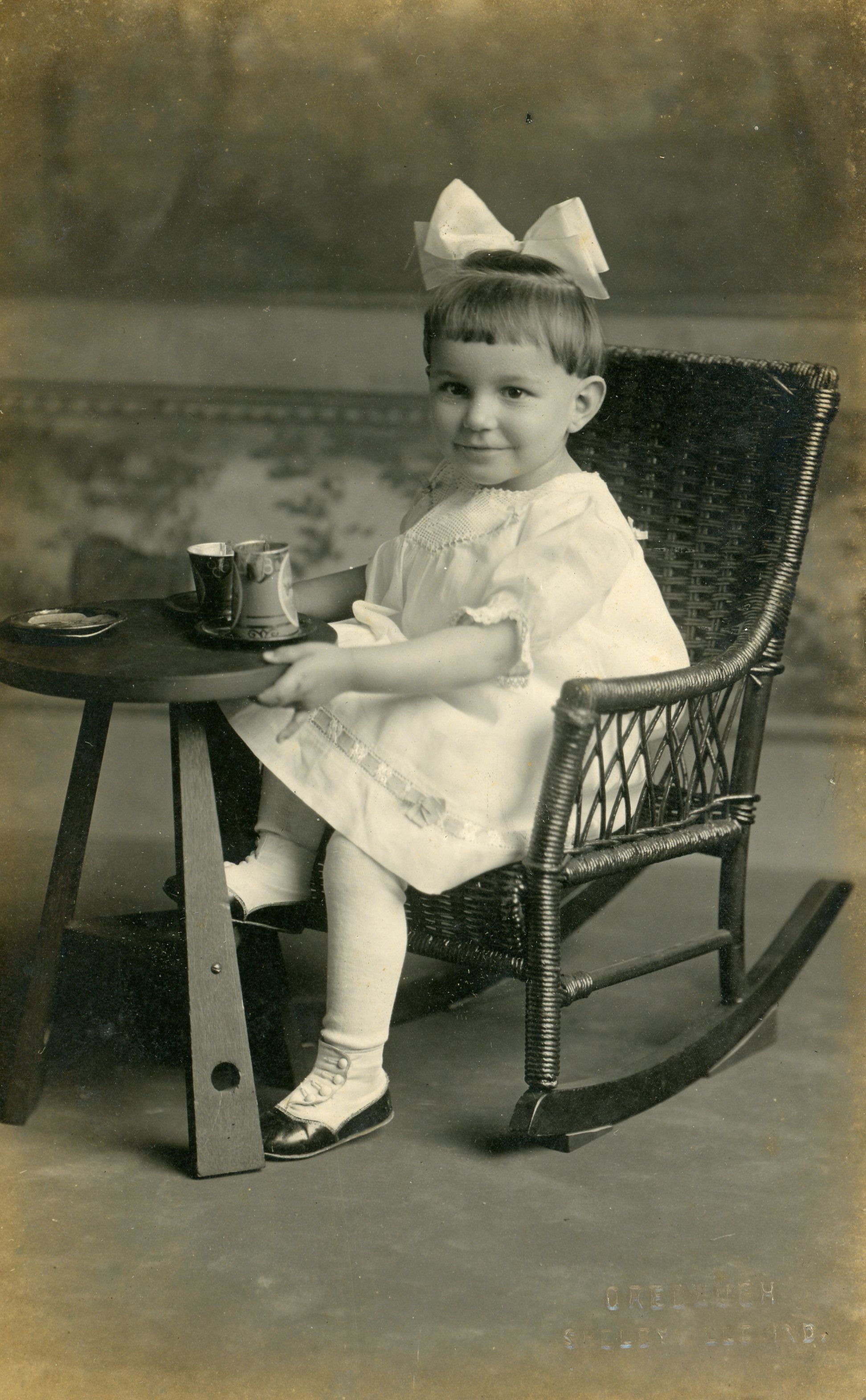 A black and white portrait photograph of a young girl with light, short hair and dark eyes. She is dressed in a white cotton dress with white stockings, black and white leather shoes, and a white bow in her hair. She is seated in a dark wicker rocking chair and her hands are holding onto the rounded edge of a dark circle table with three legs. On the table are two tin cups and a plate. There is a floral backdrop out of focus in the background.Photograph Details
