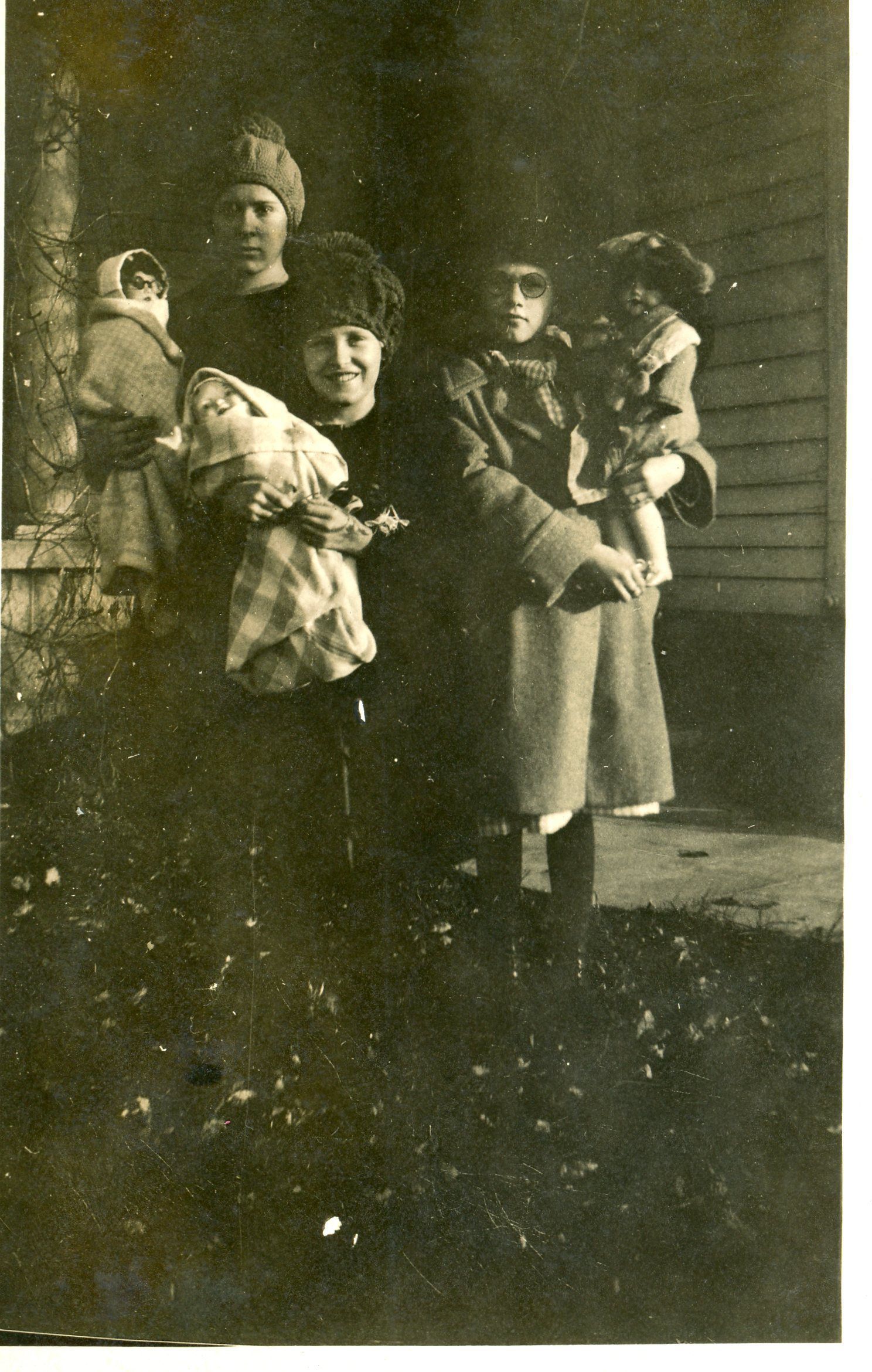 A sepia-toned snapshot of a three girls in winter hats and coats holding dolls.Photograph Details