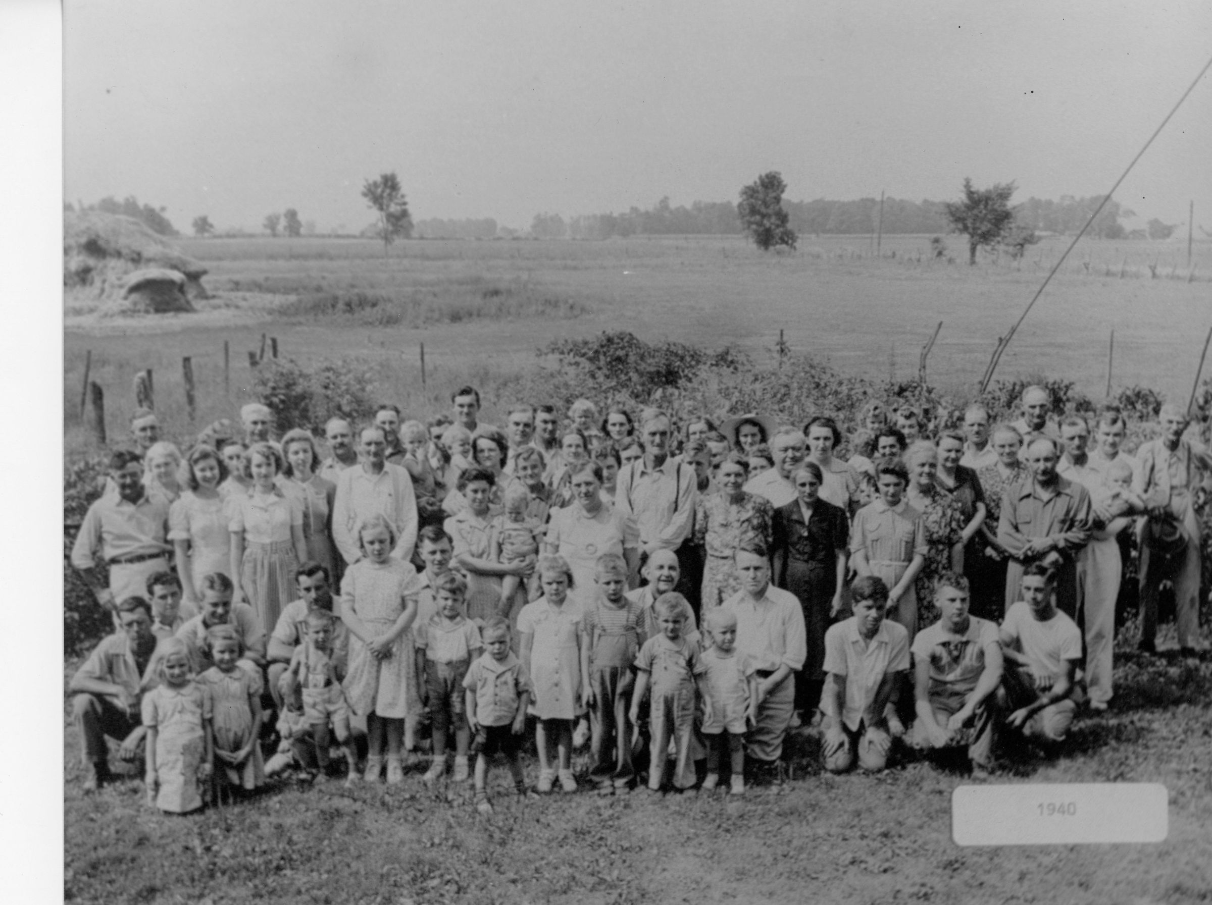Black and white photograph of group of males and females, multigenerational lined up in 5 rows. Background is farmland.Photograph Details