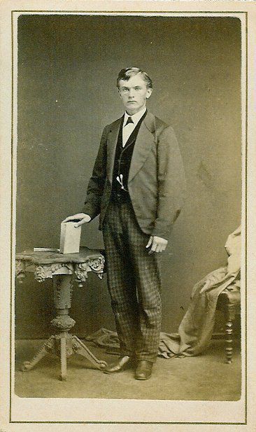 Man standing with right hand holding a book on edge on ornate table; man has hair parted on right; checkered pants; lighter suit coat; dark vest, white shirt and dark tie; chair in right background with a piece on material draped over. Printed on back in purple is Photographer. Gold design around printing.Collection