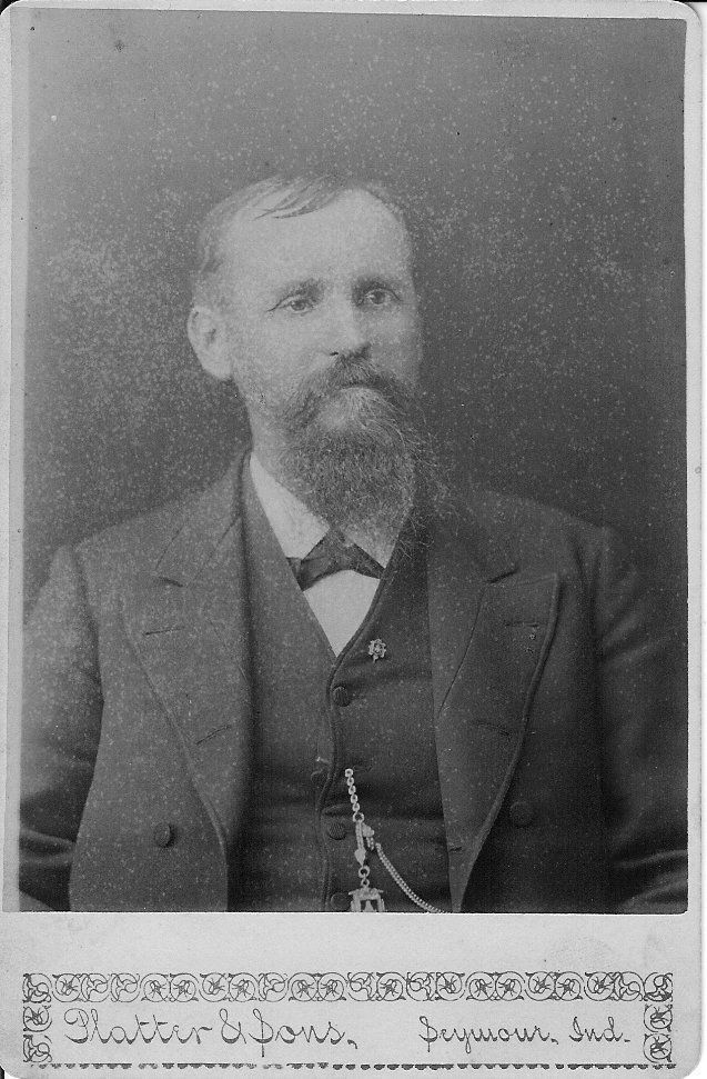 Black and white cabinet photograph of an unidentified male. Upper torso view, receding hairline, mustache, whiskers, watch chain and fob, dark vest, jacket, tie, white shirt.Collection