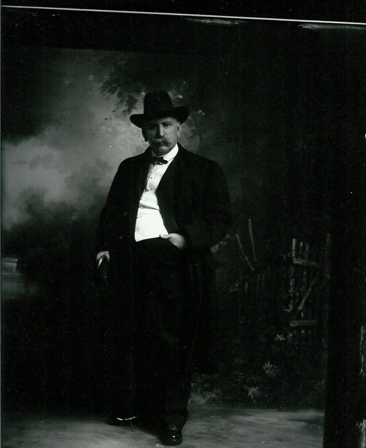 negative on a vertical format, full frontal of older man. Has a mustache and looks like is wearing a Homburg hat, also wearing a top coat and has his left hand in his trousers pocket. Print made of neg. 2/2004. See also 80.39.50.Collection