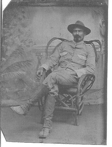 Tintype; full view of man seated in bentwood chair; subject has mustache and chin whiskers but not quite a Van Dyke style; wearing broad brimmed hat; clothing is uniform style in cut & appearance, shoulder straps, stand-up collar, pocket flaps and cuffs in contrasting shade to rest of tunic; tunic closes w/single row of buttons & has cloth belt/band w/2 buttons; wearing leggings that cover most of lower leg; doubtful if it is a military uniform.