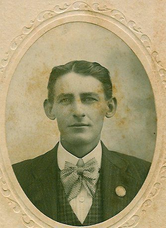 Black and white photographic cabinet print in portrait format. Image is of a young man; hair is parted on right and combed back. Wearing a dark coat, plaid vest, white shirt, striped bowtie, pin on left lapel. Inscribed in ink on back of mount: "From Ary to Nellie." Printed on lower right corner of mount: "JNo. L. Rohm, Fountaintown, Ind."Collection