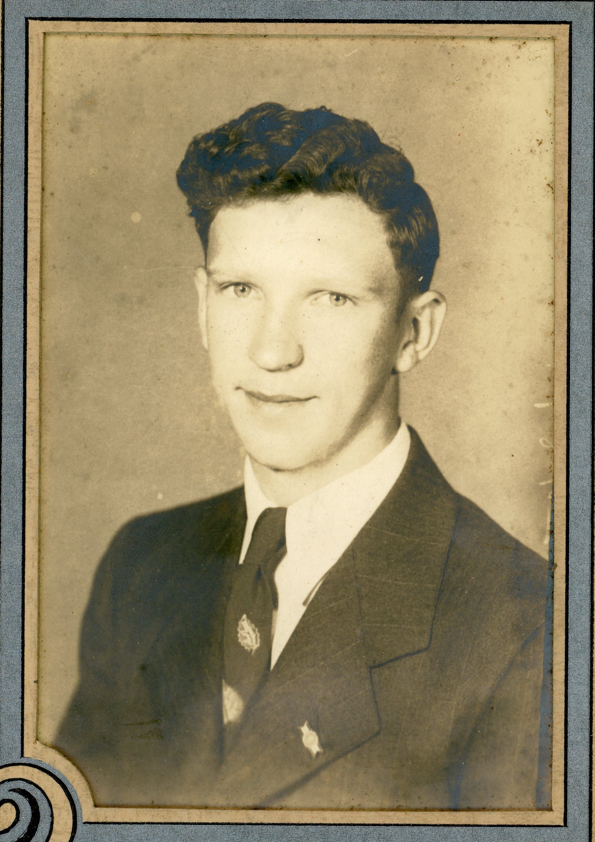 A black-and-white photographic portrait of a man with dark wavy hair and light eyes wearing a dark suit. He also wears a tie with a leaf pattern and a small lapel pin.Photograph Details