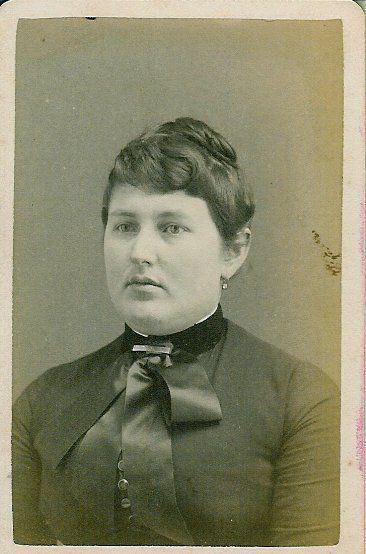 Carte-de-visite probably on albumen paper. Upper torso view of seated woman. Her hair is done up on top of her head. She is wearing an earring & her collar comes to her chin. Collar is fastened w/ a broad silk or satin ribbon & held in place by a long narrow metal object. Back of mount: "Excelsior Art Gallery/D. R. Merrill/Photograph Artist/N. W. Cor. Market and Walnut Sts./Harrison, Ohio"/and additional info about services of the studio. Donation, 3/1963 by Mrs. Dolph O. Harrod. Used by Zerilla Kimberling.Collection