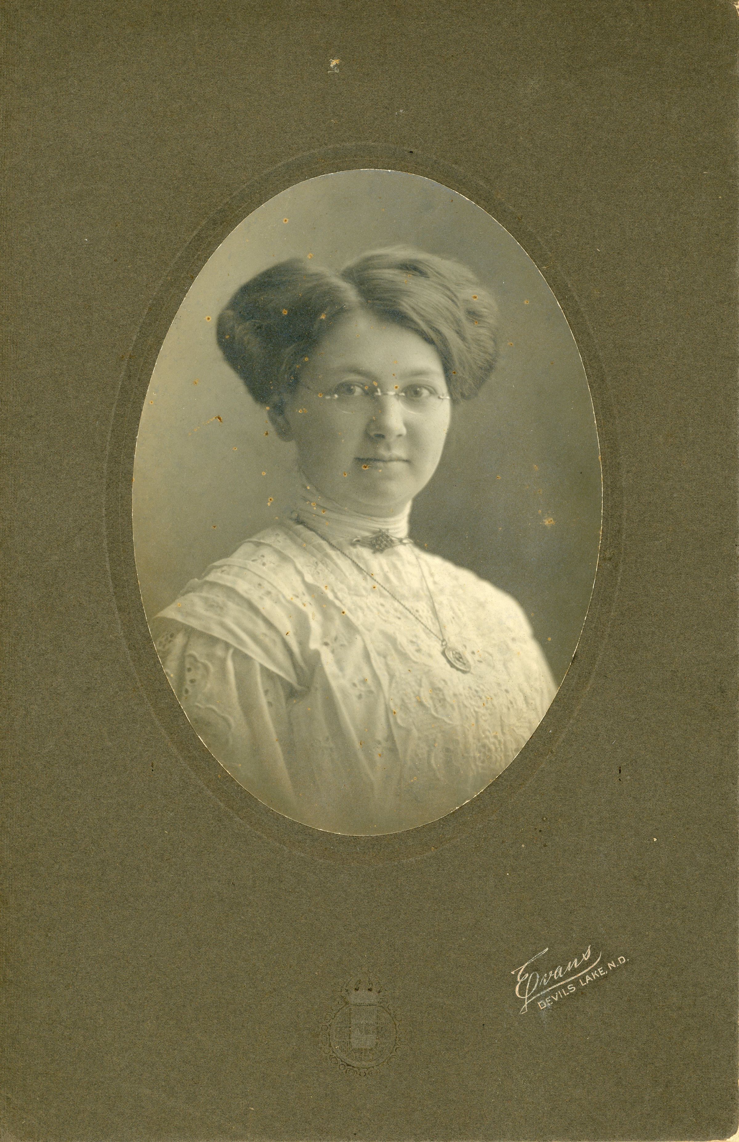 An oval black-and-white photographic portrait of a woman wearing a poofy up-do. She wears small oval glasses, a high-collared white dress with a pendant at the base of the neck, and a long necklace.Photograph Details