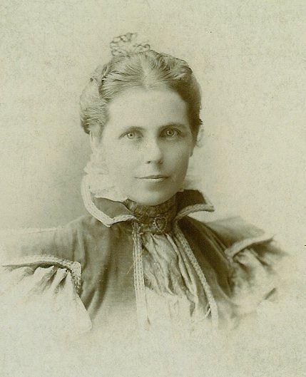 Sepia photographic cabinet print in portrait format. Image is a waist-up view of a young woman; hair pulled back and up. Wearing a high-collar velvet garment with braid trim; silk blouse with hi-collar and heart-shape pin. Light eyes. Printed at bottom edge of mount: "W. B. Cuyler/Greenfield/Ind." No identification. Donation, 1993.Collection