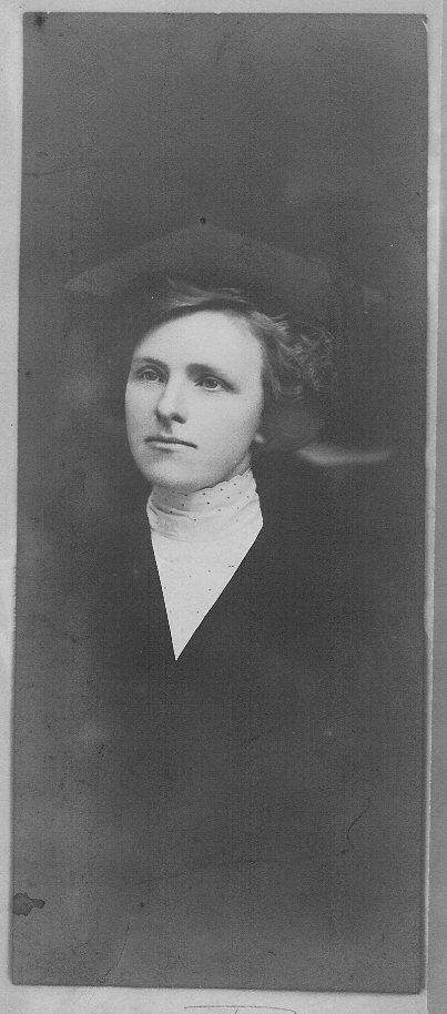 b & w print of woman; hair appears parted on left combed loose & full over ears & behind head; blouse has stand-up collar that reaches jaw line, small floral pattern in collar & appears to have row of small holes; only a V-section on front of blouse shows, shoulders & bodice blacked out; appears photograph tried to draw in mortar board & tassel on woman's head. Assume graduation pictureCollection