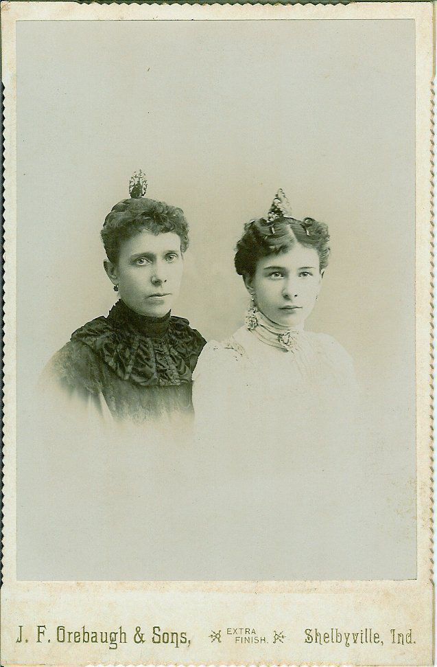 Black and white cabinet print; subject is two females, portrait view; subject on left has hair combed back except for curly area in front and some kind of ornament at back of head; small dangle earring in right ear; dark garment w/high and elaborate collar, appears to have some sort of dark lace over trim on dress; subject on right hair parted in middle with 2 barrettes on crown holding hair in an upsweep over the ears, also has some kind of ornament at back of head; small dangle earring in right ear; light colored dress w/high collar that appears to have 2 large rosettes on it mount has scalloped section on all four sides.