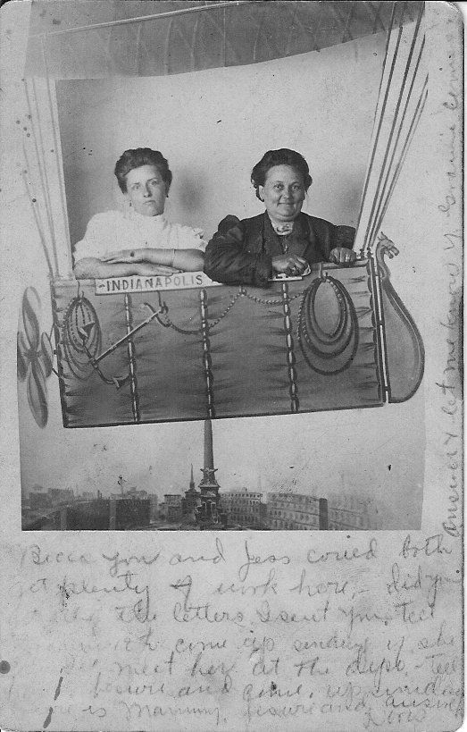 Black and white photographic postcard in portrait format. Image is of two women posed behind a hot air balloon prop. Woman on left wearing white. Woman on right wearing dark garment and smiling at camera. The balloon prop has INDIANAPOLIS on the left. Postmarked: Indianapolis, Ind./Jun 17/2 - pm/1909.Collection