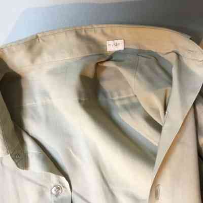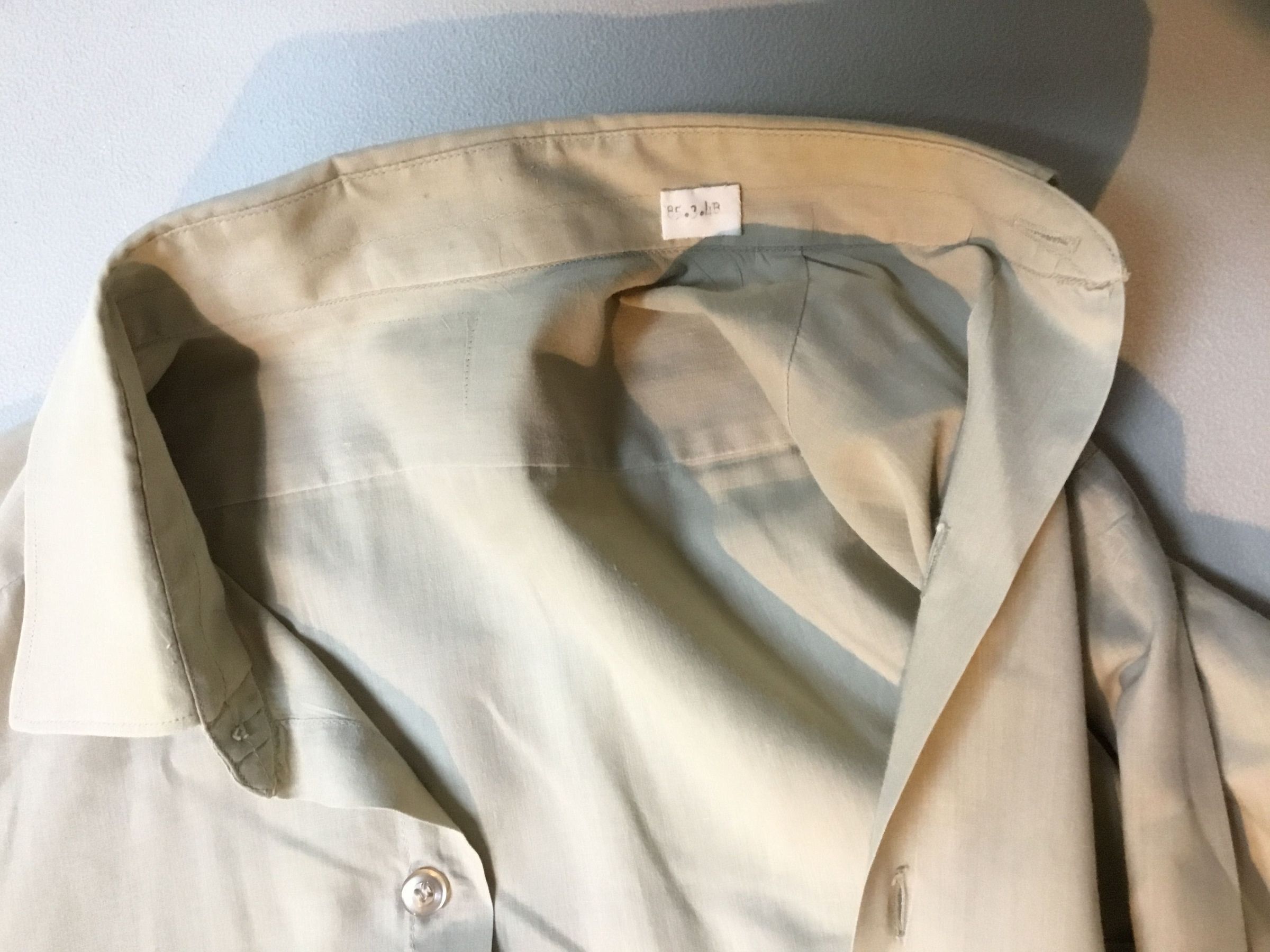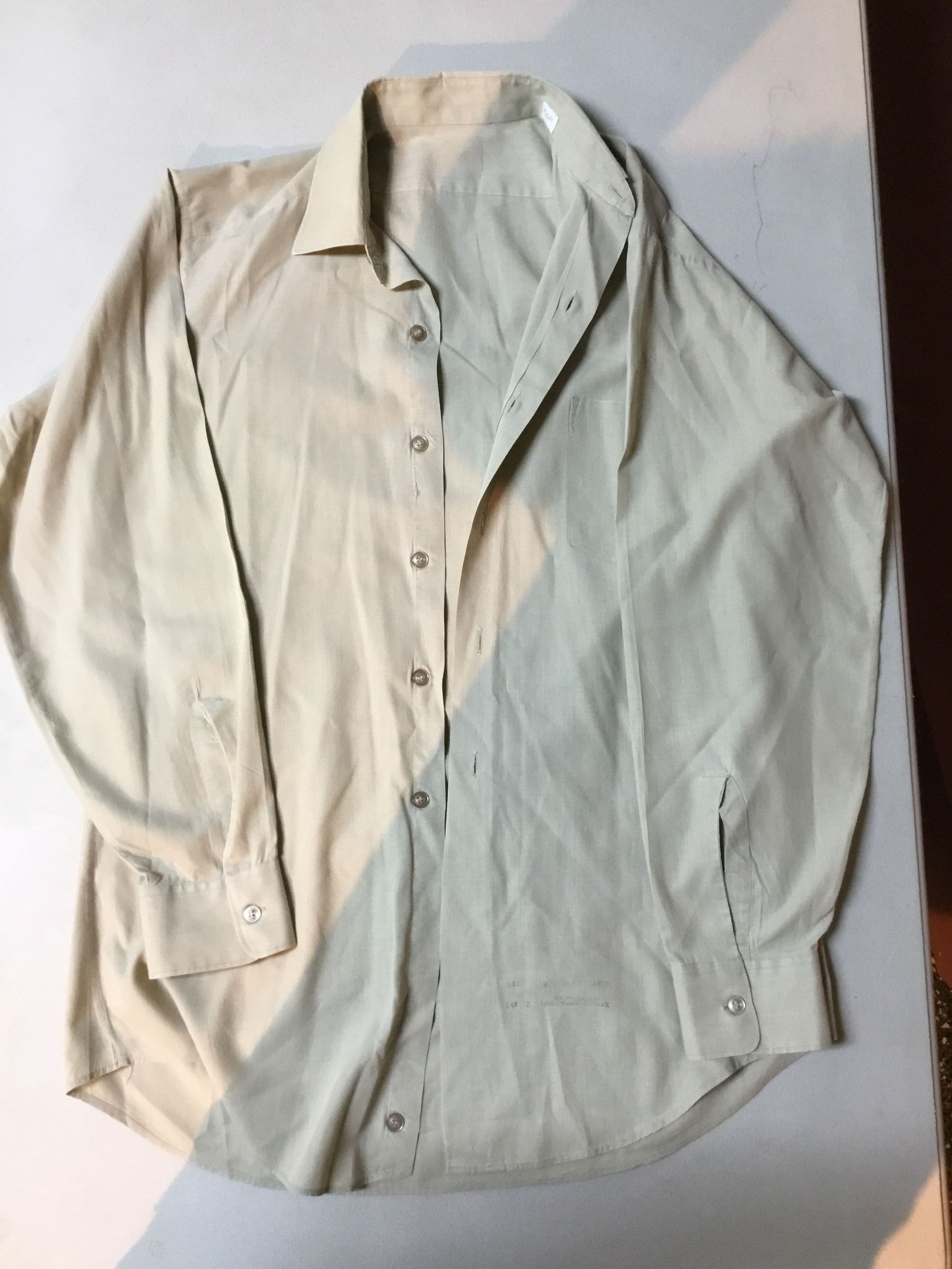 A: Shirt, long sleeves, lightweight cotton: Summer Class A, one left pocket, six buttons, extra button on hem at bottom.Collection