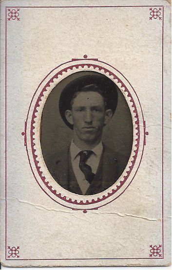 Tintype Photograph of unknown adult male, encased in white mat frame. Back of photo has a handwritten, illegible first name, last name Fox.Collection
