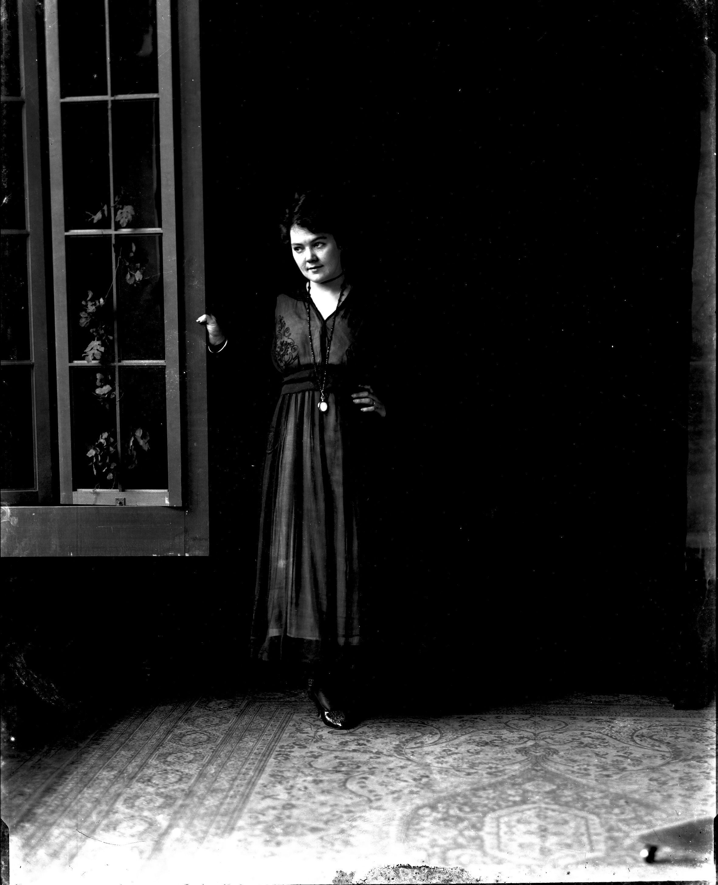 Unidentified female, interior shot with subject with right hand on an open window sash, looking at an unseen outdoor view. Glass-plate negative.