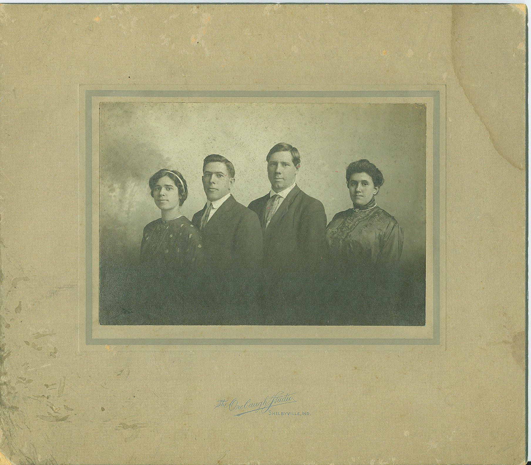 3.75" x 5.5" sepia glossy photo in landscape format mounted on 9" x 8" cardboard featuring the Orebaugh Studio insignia at the bottom of the mount. The image shows four unidentified adults. There are two women, positioned on the ends, and two men, positioned in the middle.Collection
