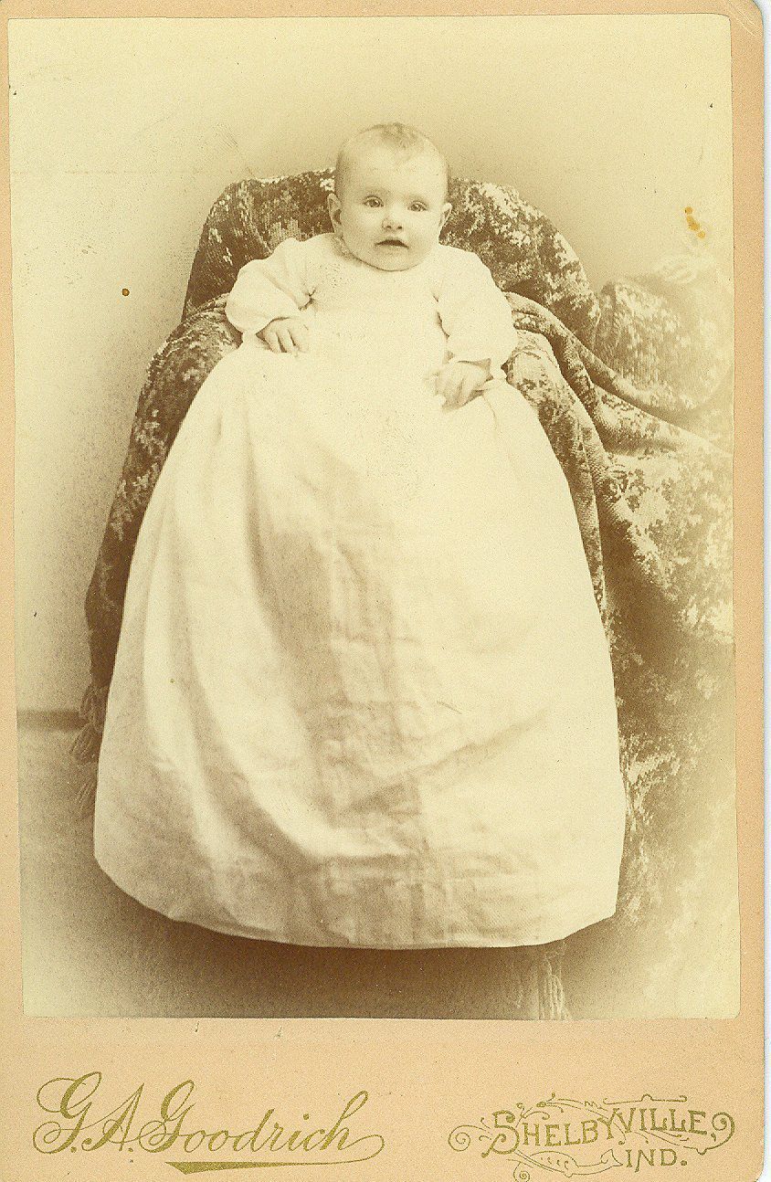 6.5" x 4.5" sepia matte photo in portrait format. Image shows a full body portrait of a baby laying against a seat to prop him/her up. The seat is drapped in floral fabric. The baby wears a long, white gown.Collection