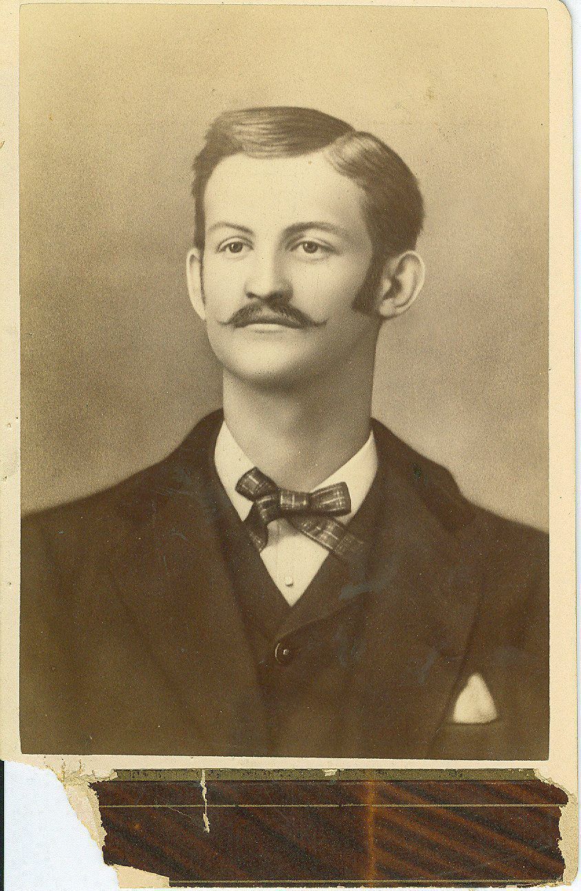 6.5" x 4.5" sepia matte photo in portrait format. Image shows a bust portrait of a man in a dark suit with a plaid bow tie. His hair is parted to the left and he has a handle-bar mustacheCollection