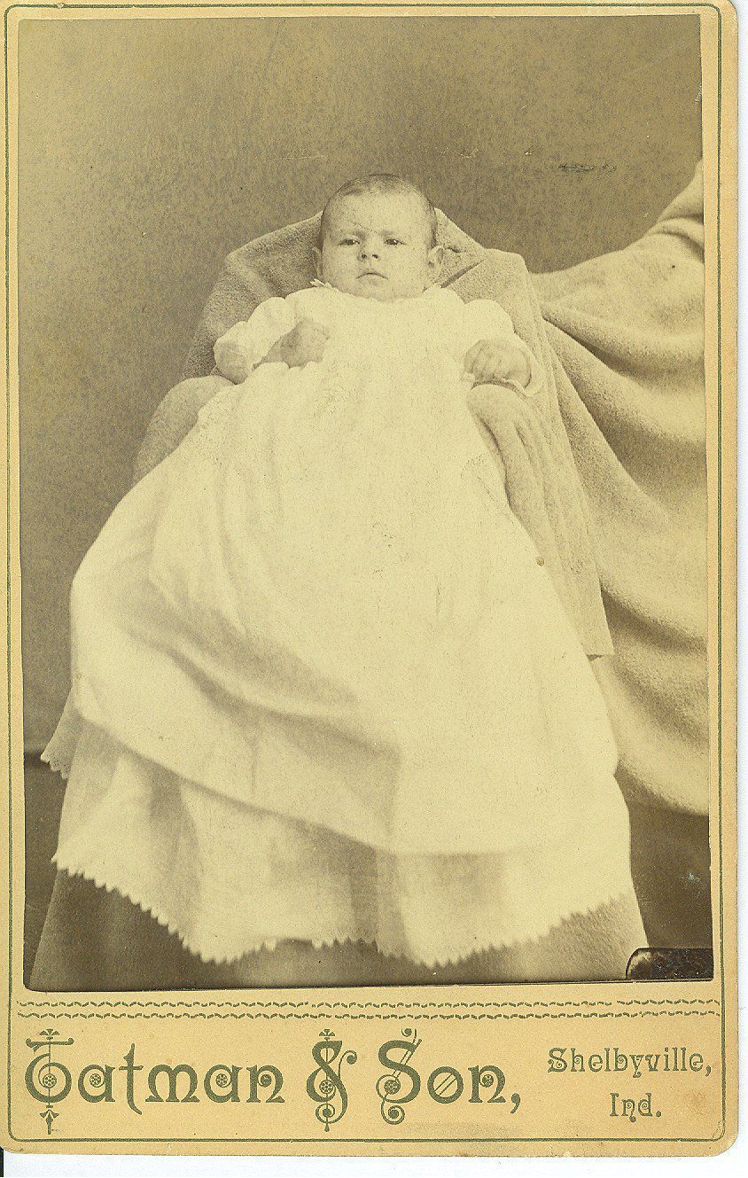 6.5" x 4.5" sepia matte photo in portrait format. Image shows a full body portrait of a baby laying against a seat to prop him/her up. The baby wears a long, white gown.Collection