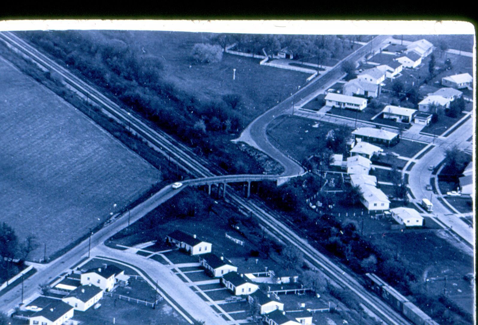 Donation, 07/26/2005. Black and white photographic slide in landscape format. Slide frame is marked: "Aerial view Amos Rd/viaduct 1969."Collection
