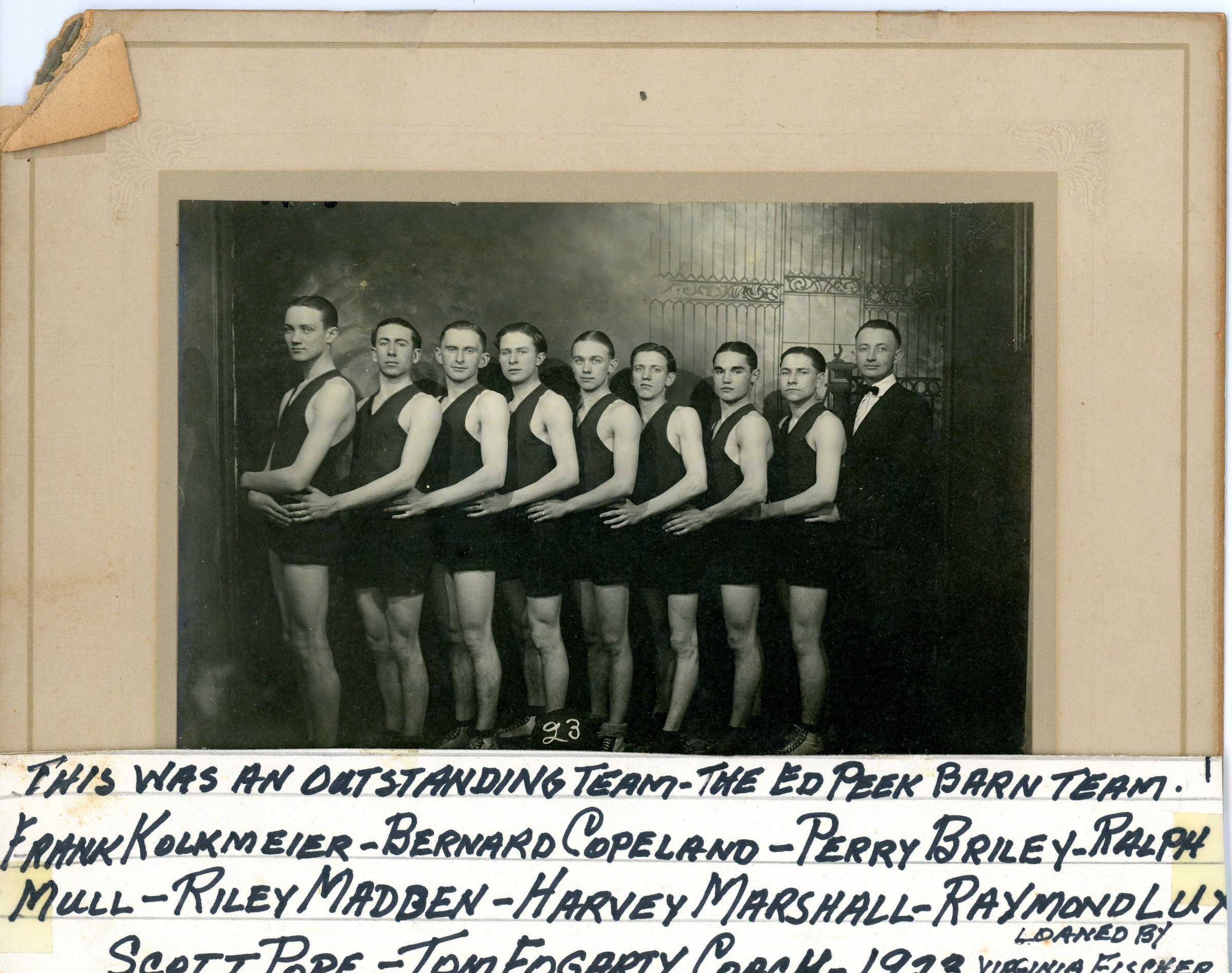 Players and coach are identified under photograph: "This was an outstanding team - The Ed Peek Barn Team. Frank Kolkmeier - Bernard Copeland - Perry Briley - Ralph Mull - Riley Madden - Harvey Marshall - Raymond Lux - Scott Poe - Tom Fogarty Coach"Subject Person or Organization