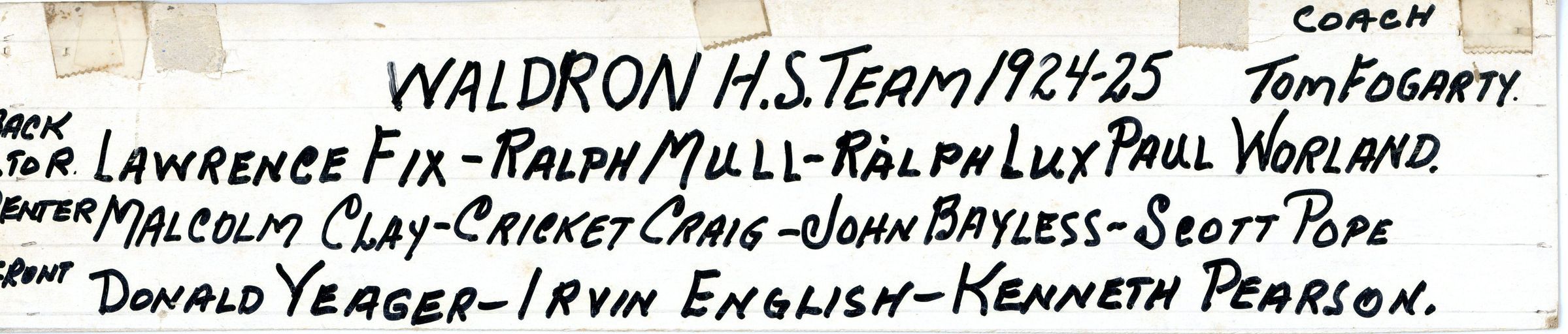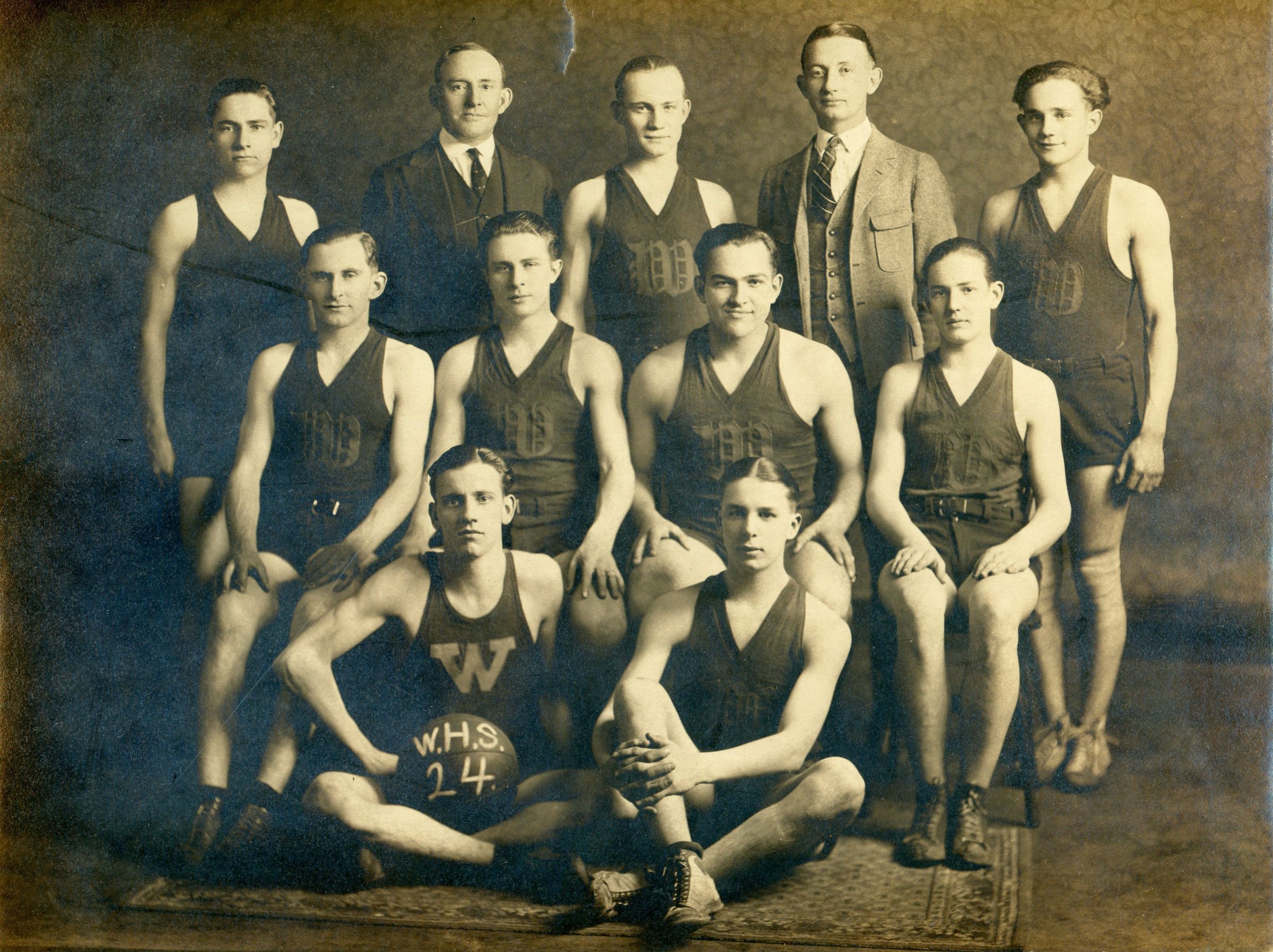 Basketball team; Row 1: Harvey Marshall, Donald Yeager Row 2 Perry Briley, Presley Peek, Paul Worland Row 3: Scott D. Pope, Wm. Thompson Prince, Louis Mitchell, Thomas Fogarty, Coach, Lowell HeadleeSubject Person or Organization