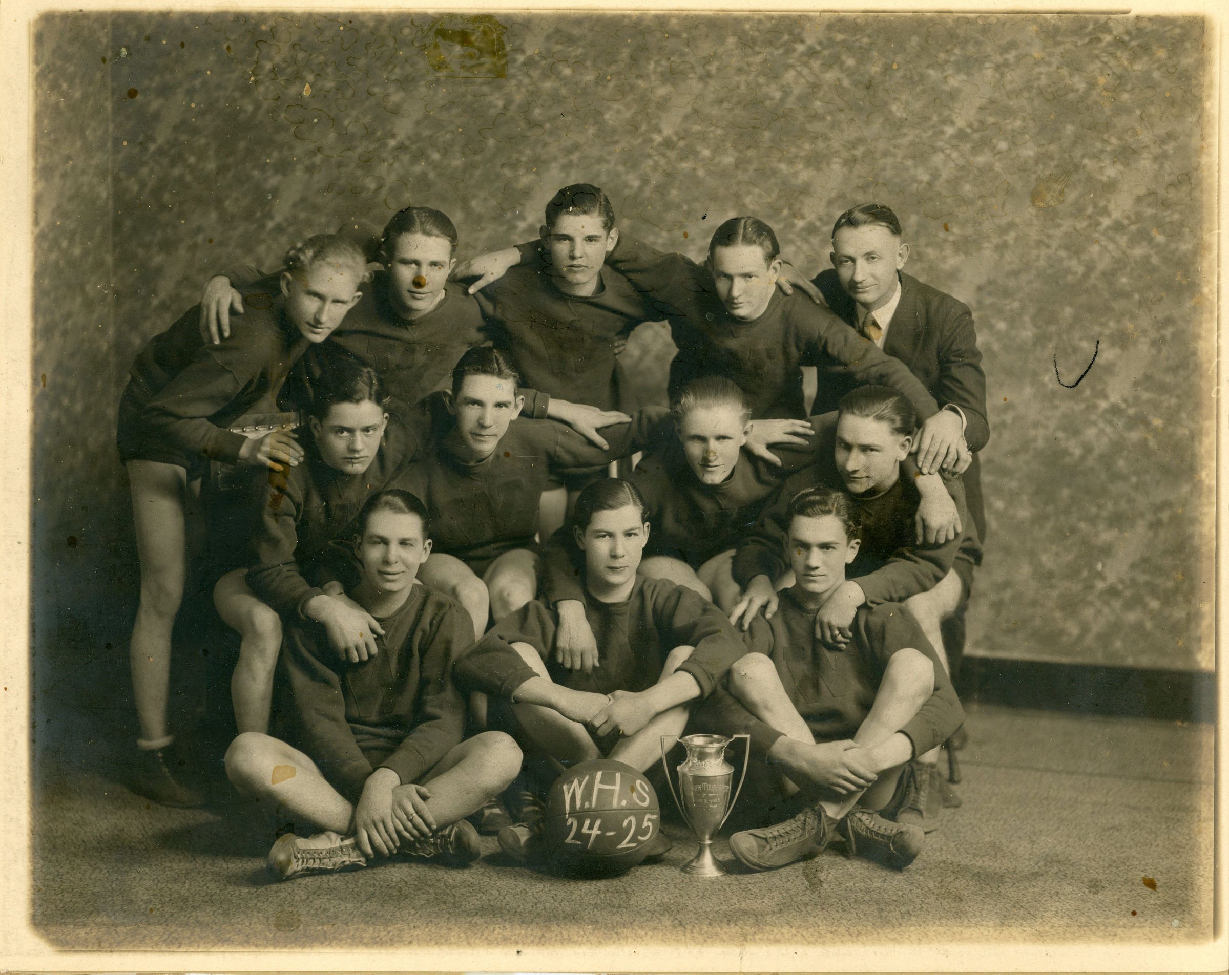 Sepia photograph of Waldron High School basketball team of 1924-25. the 13 young men are posing in 3 rows, with the front row being seated on floor, middle row sitting on bench and last row stooping down. All players except front row have their arms or hands on a team member. There is a trophy next to the basketball and the ball has written W.H.S. 24-25 in white.Photograph Details
