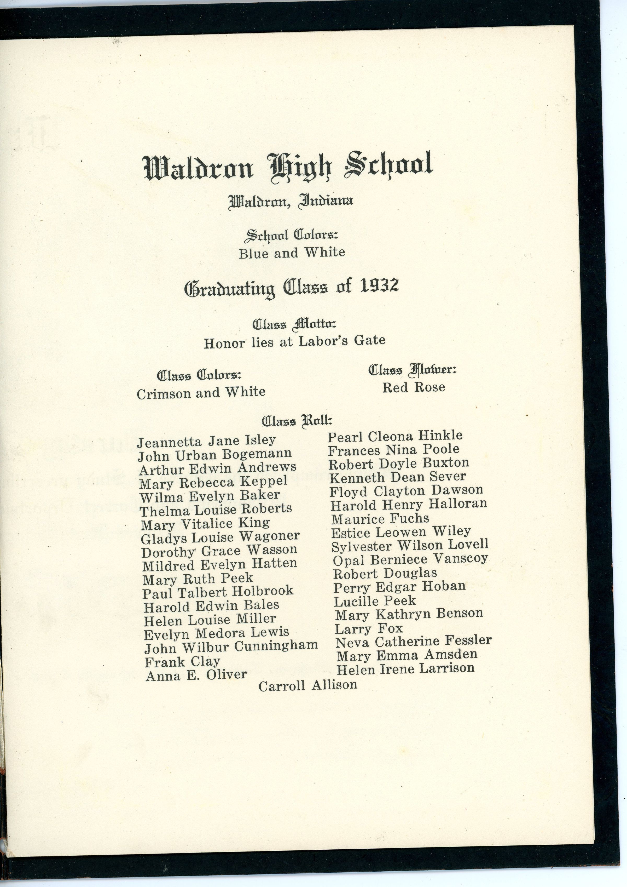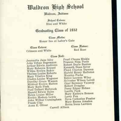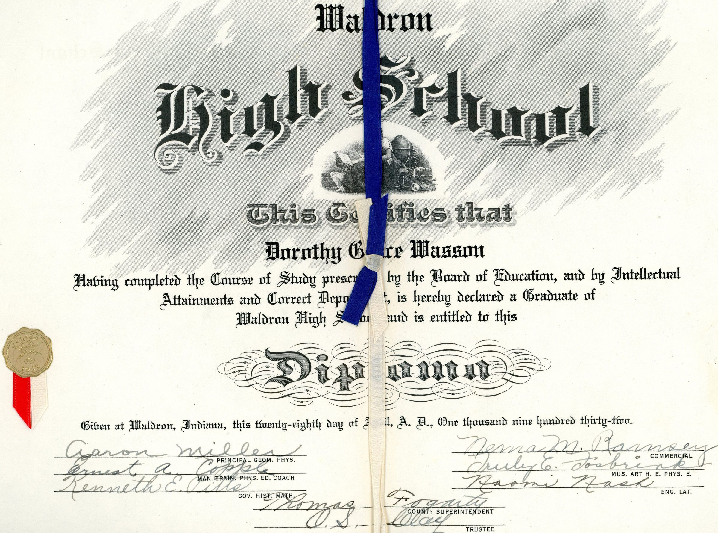 by Dorothy Grace Wasson, upon graduating from Waldron High School in 1932.Context