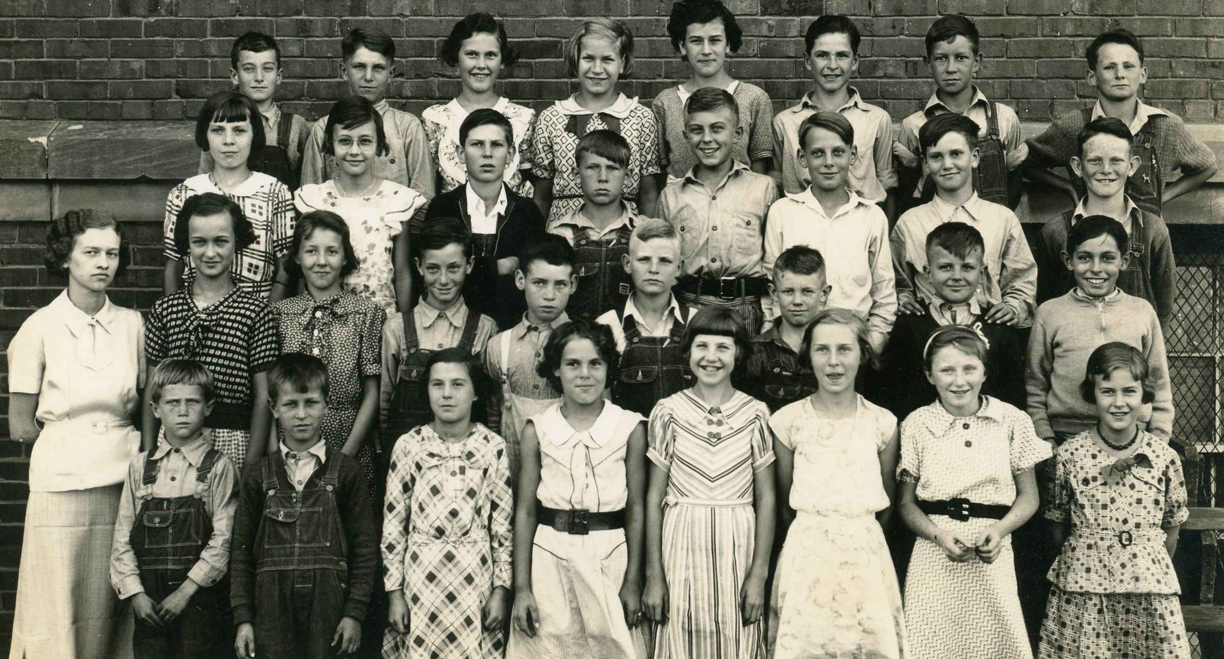 A black-and-white landscape portrait of four rows of school-aged children and one woman, a teacher. The group is posed outside.Photograph Details