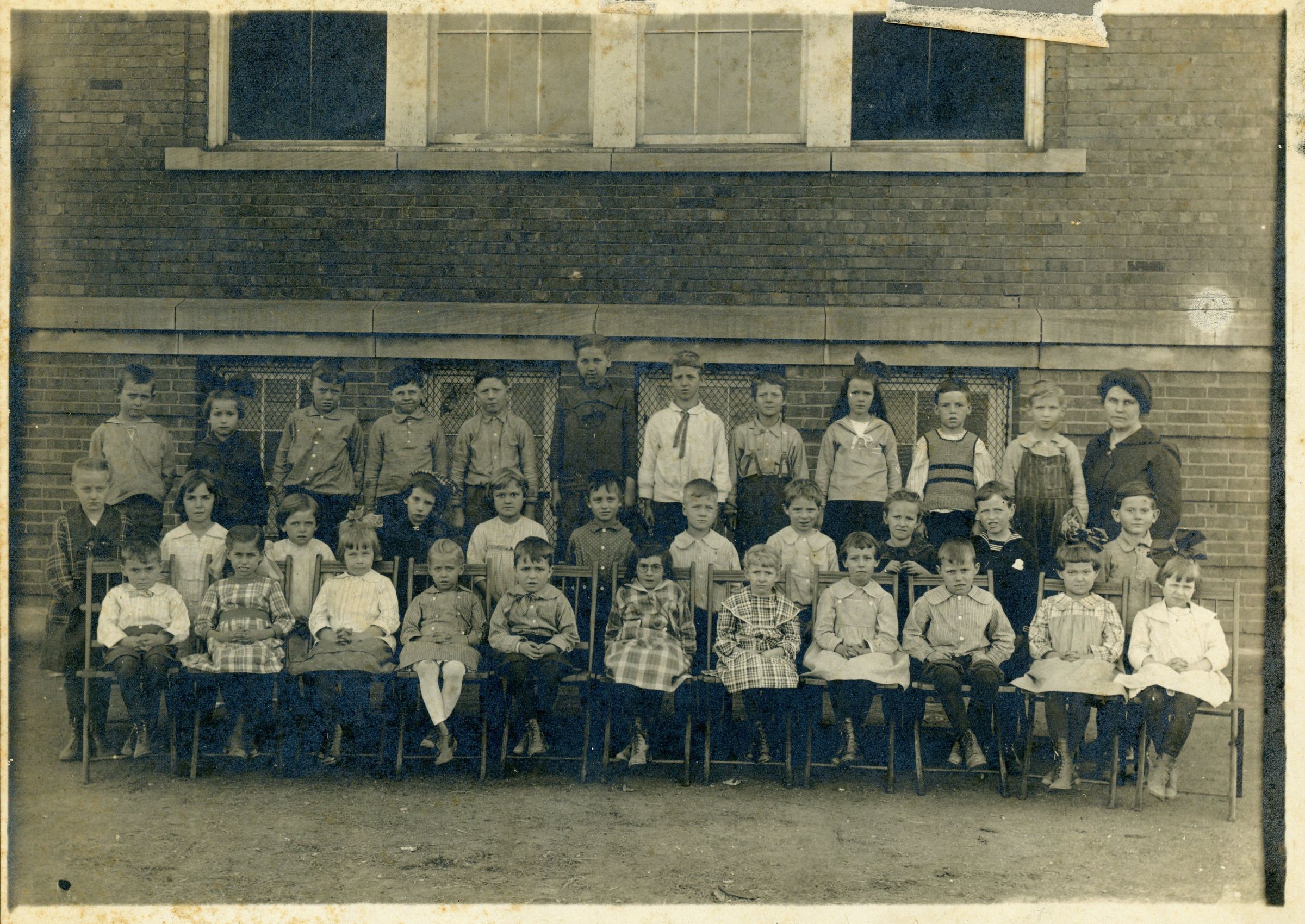 A black-and-white landscape portrait of three rows of school-aged children and one woman, a teacher. The group is posed outside in front of a brick building.Photograph Details