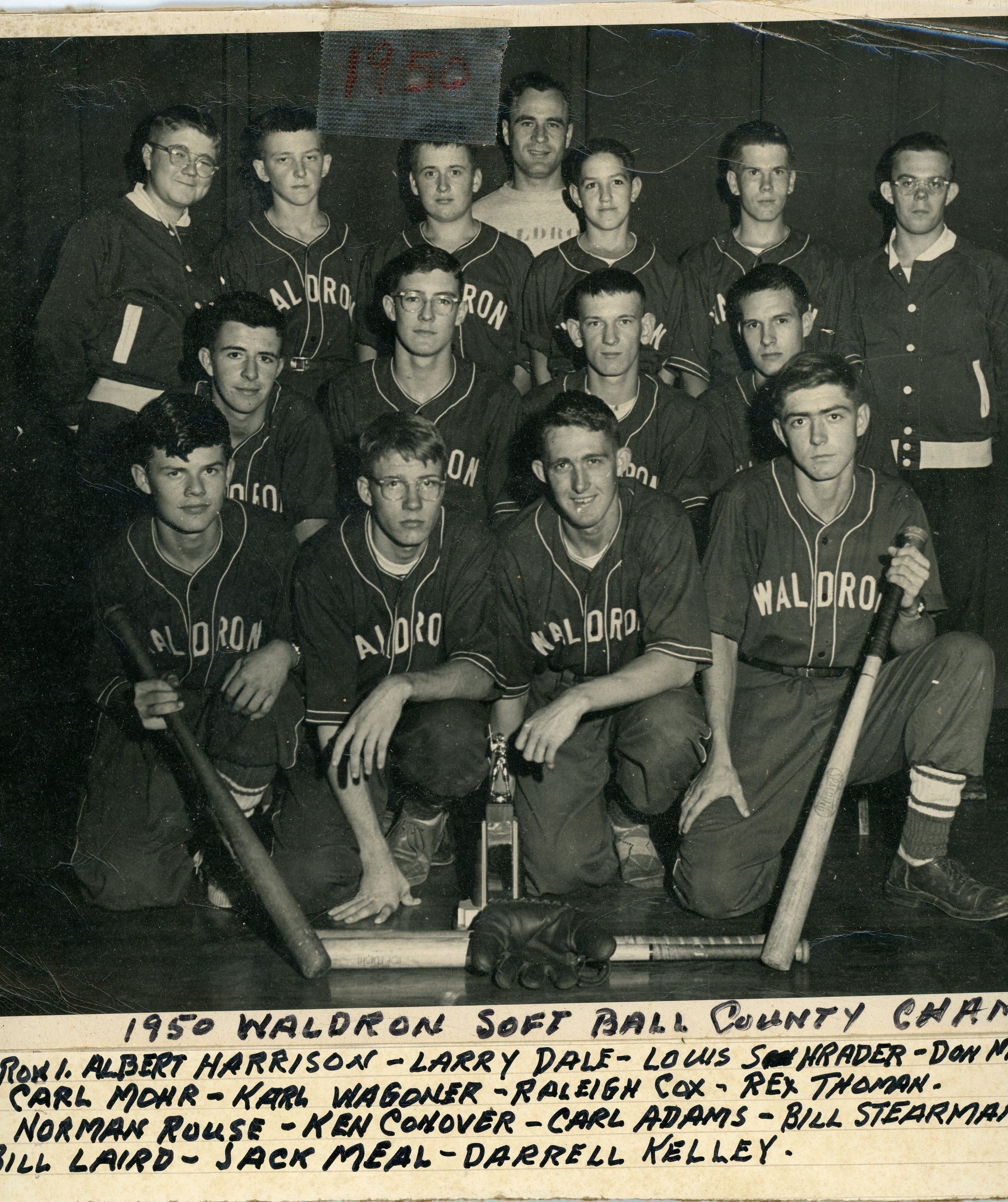 A black-and-white group photograph of a men's softball team. Their uniforms read: WALDRON. The men are posed in four rows.Photograph Details