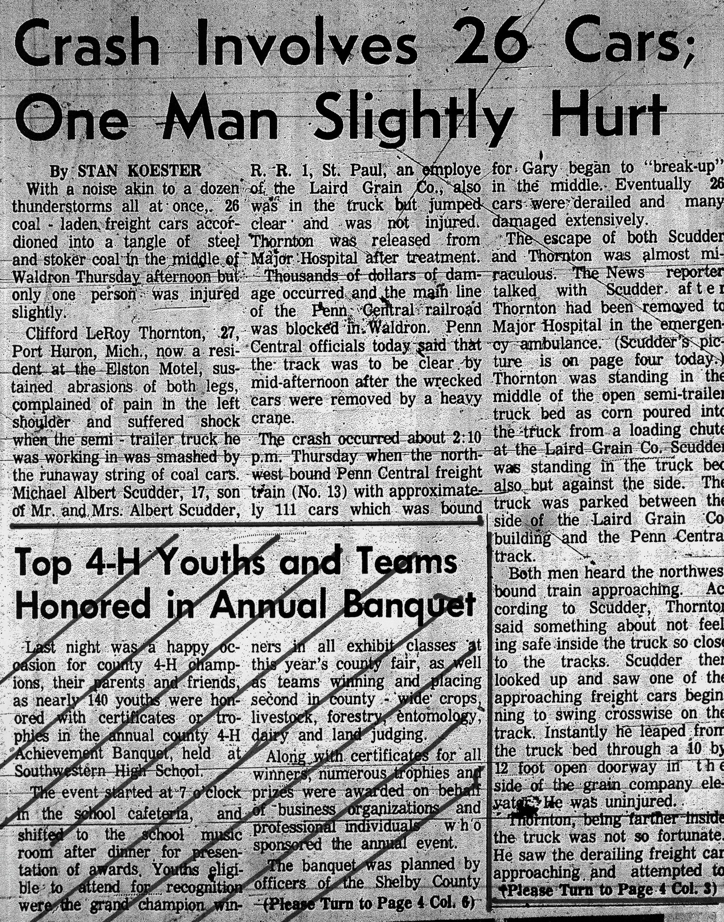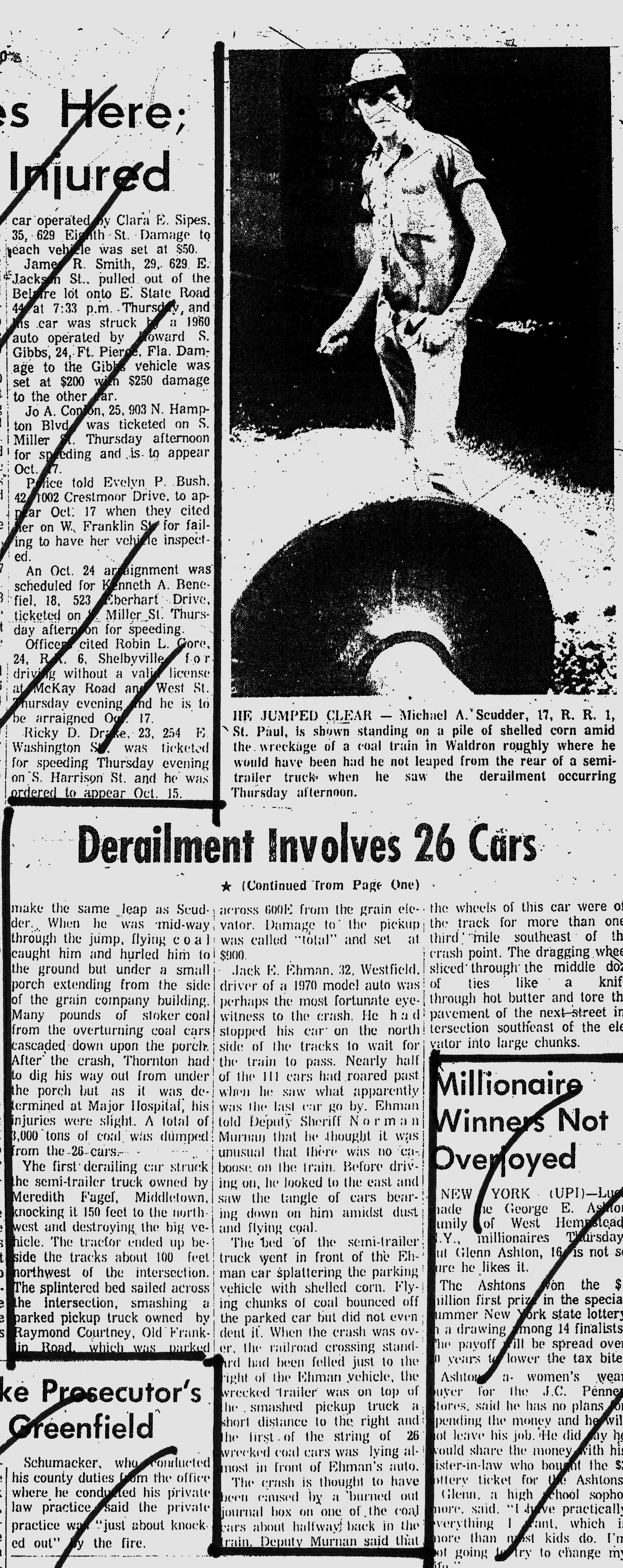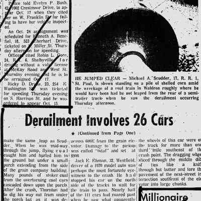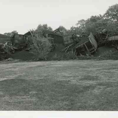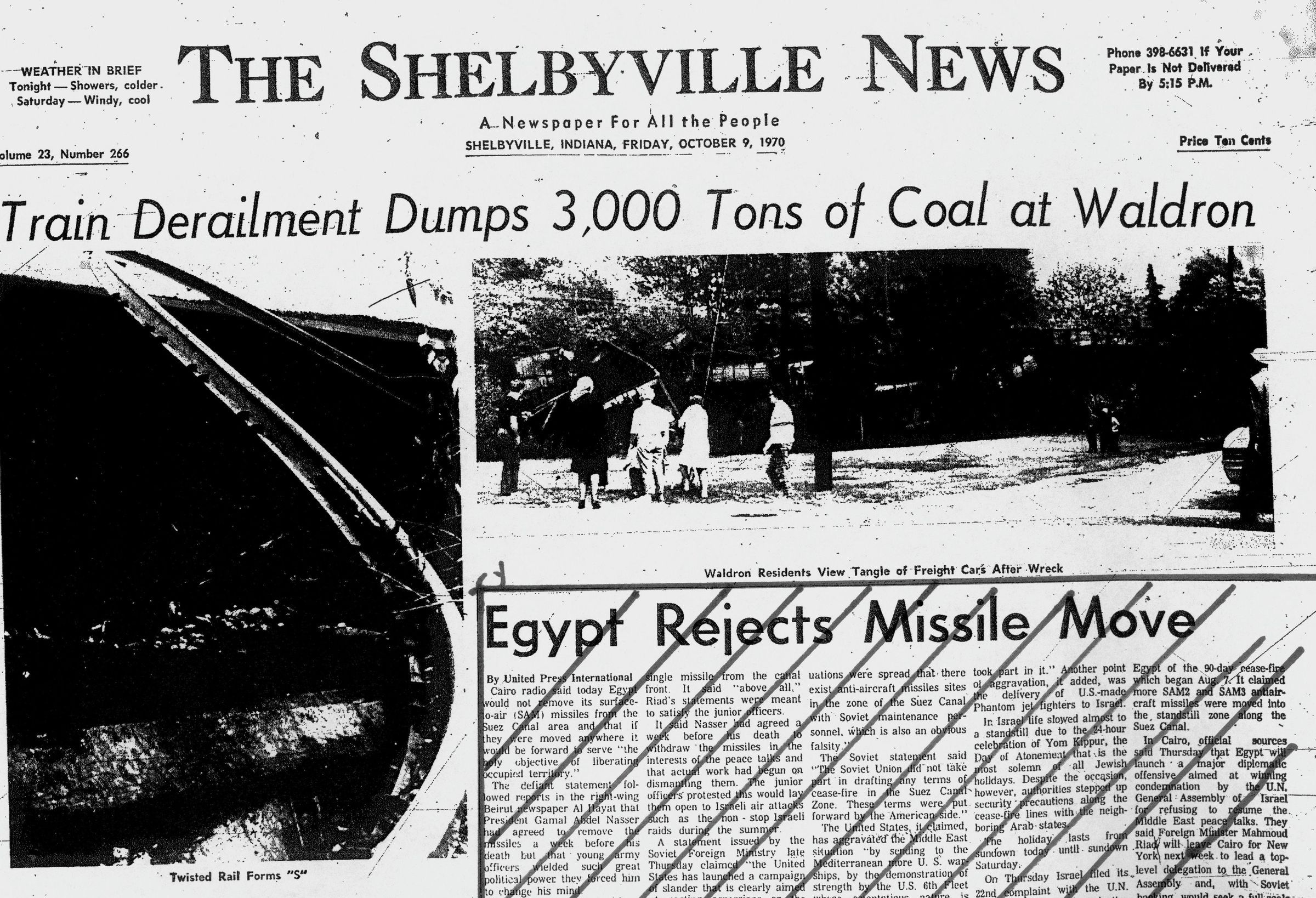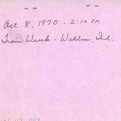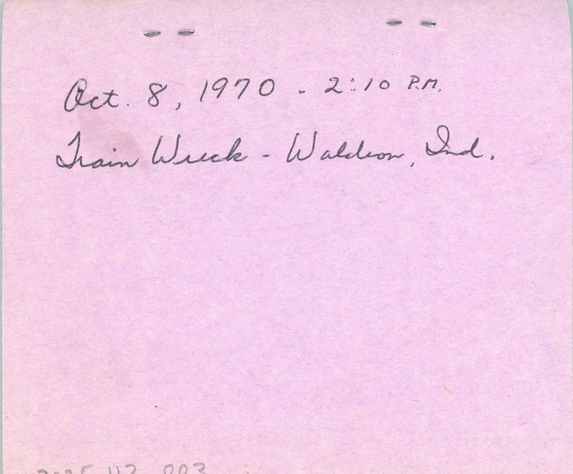 Purple booklet of the Oct 8, 1970 train wreck in Waldron, IND, which occurred at 2:10 PM. Set of 8 images stapled together in a construction paper booklet. Writing in black pen on the back. Shelbyville New coverage on Oct 9th.Photograph Details