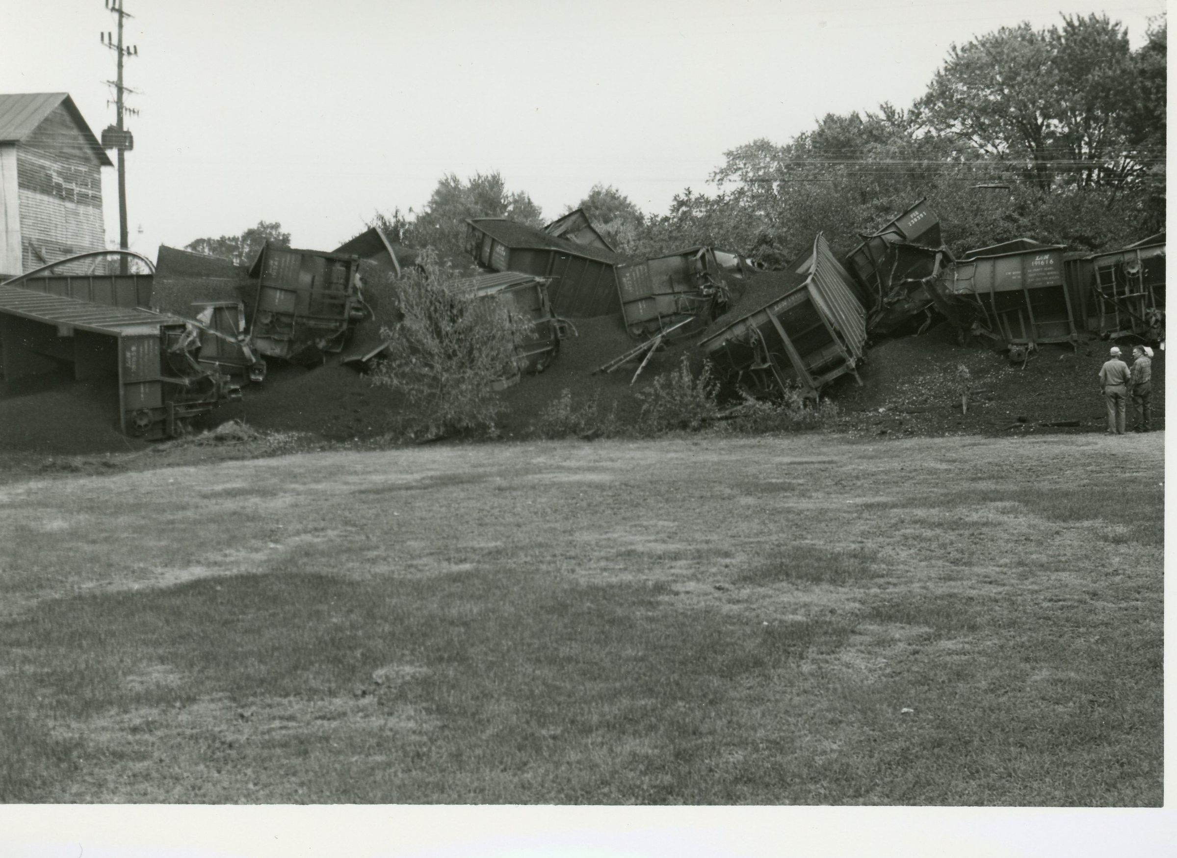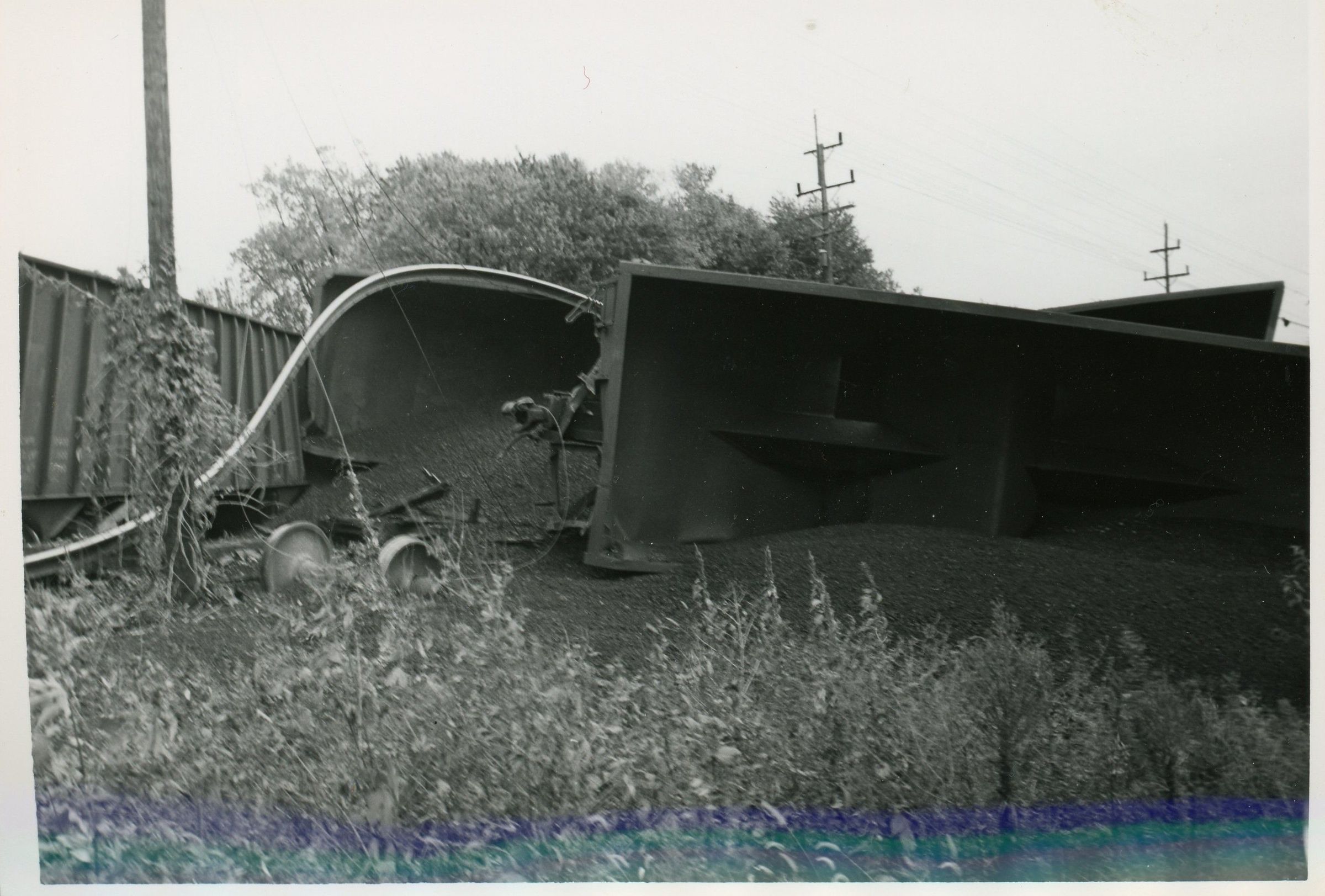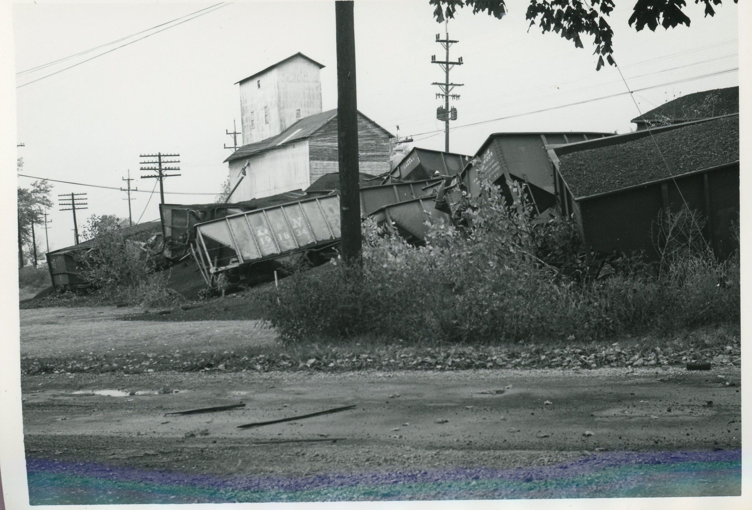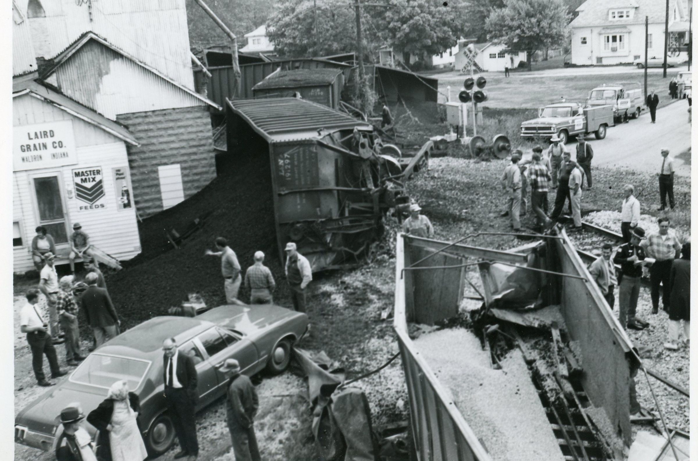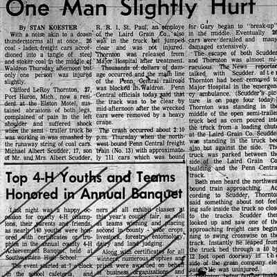 Purple booklet of the Oct 8, 1970 train wreck in Waldron, IND, which occurred at 2:10 PM. Set of 8 images stapled together in a construction paper booklet. Writing in black pen on the back. Shelbyville New coverage on Oct 9th.Photograph Details