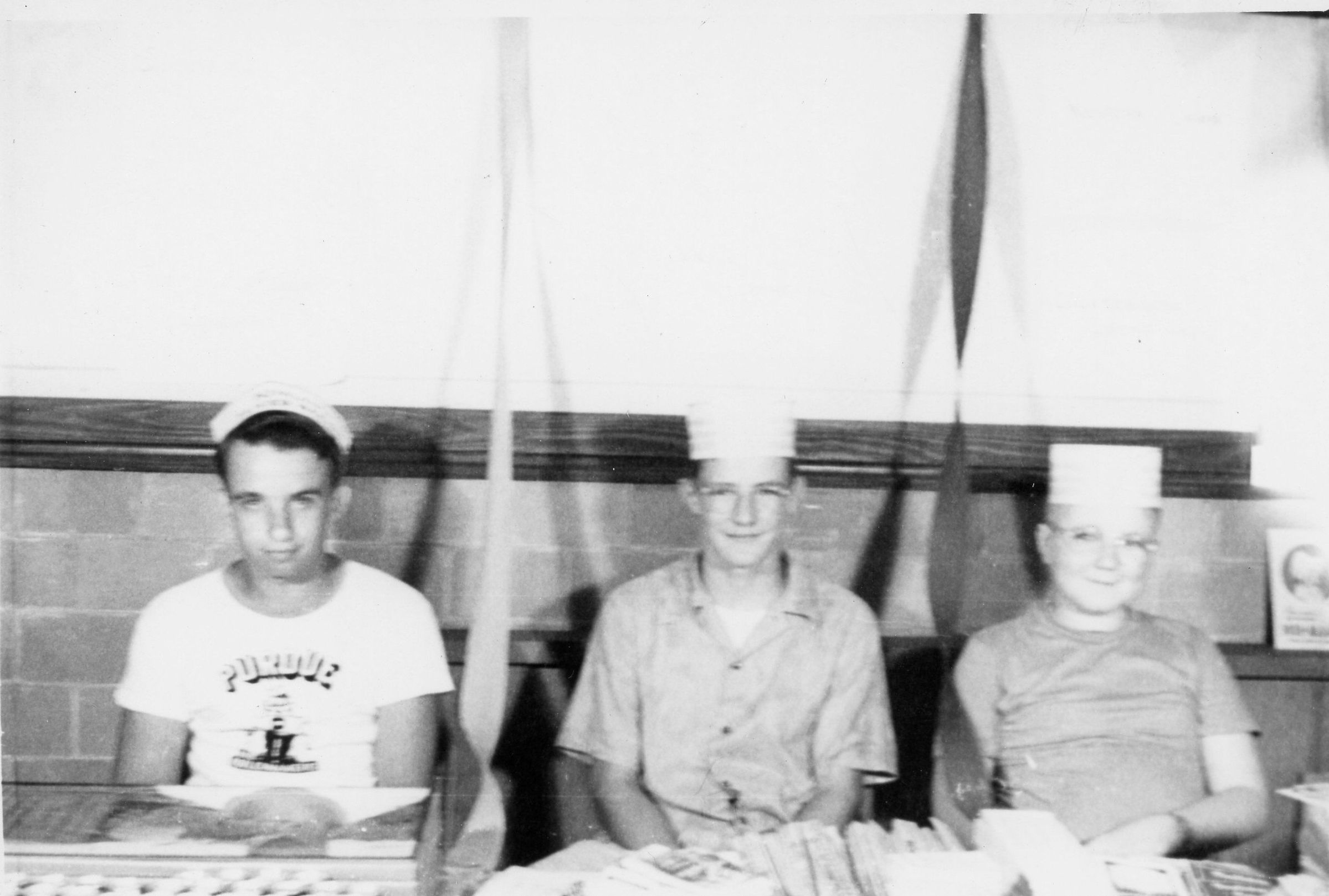 Black and white photograph of 3 men in white paper soda fountain hats behind display tablePhotograph Details