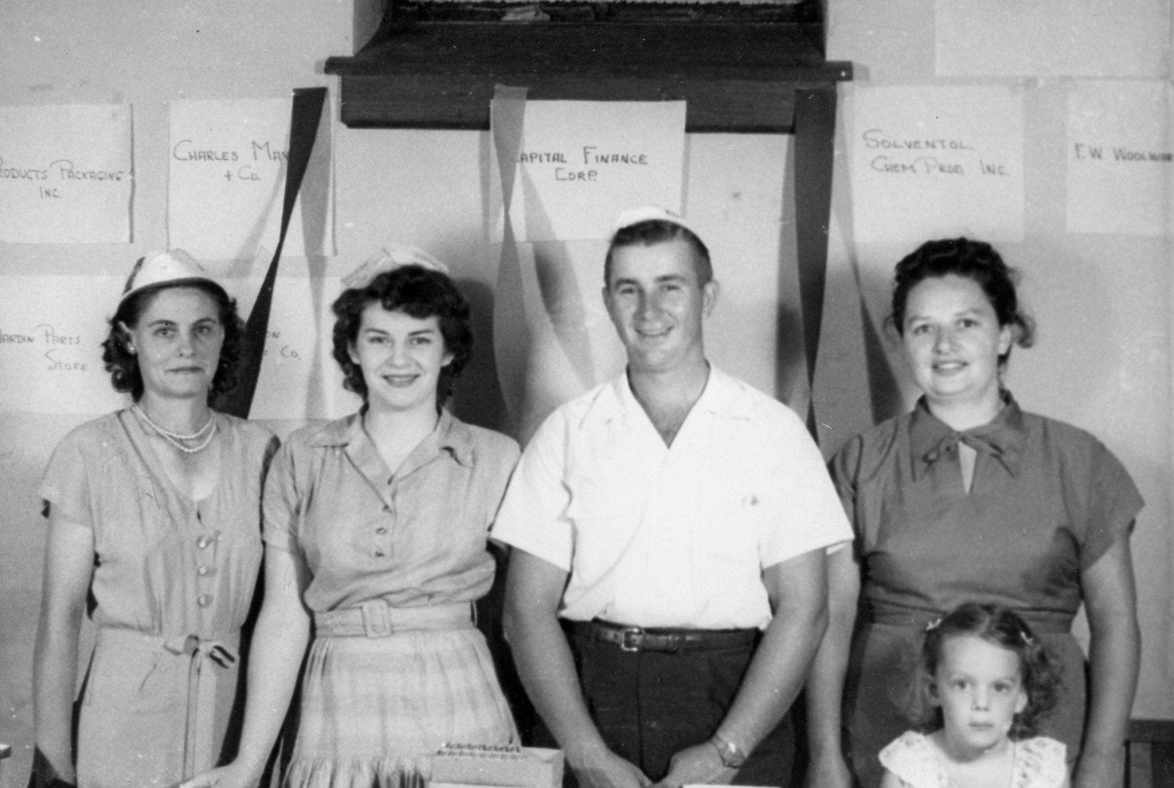 Post it note on back of photograph identifying all but the female on the left: L. ?, ML Pauline Newton ?, MR Bob Newton, R Becky Peek Meal, F Patricia MealSubject Place